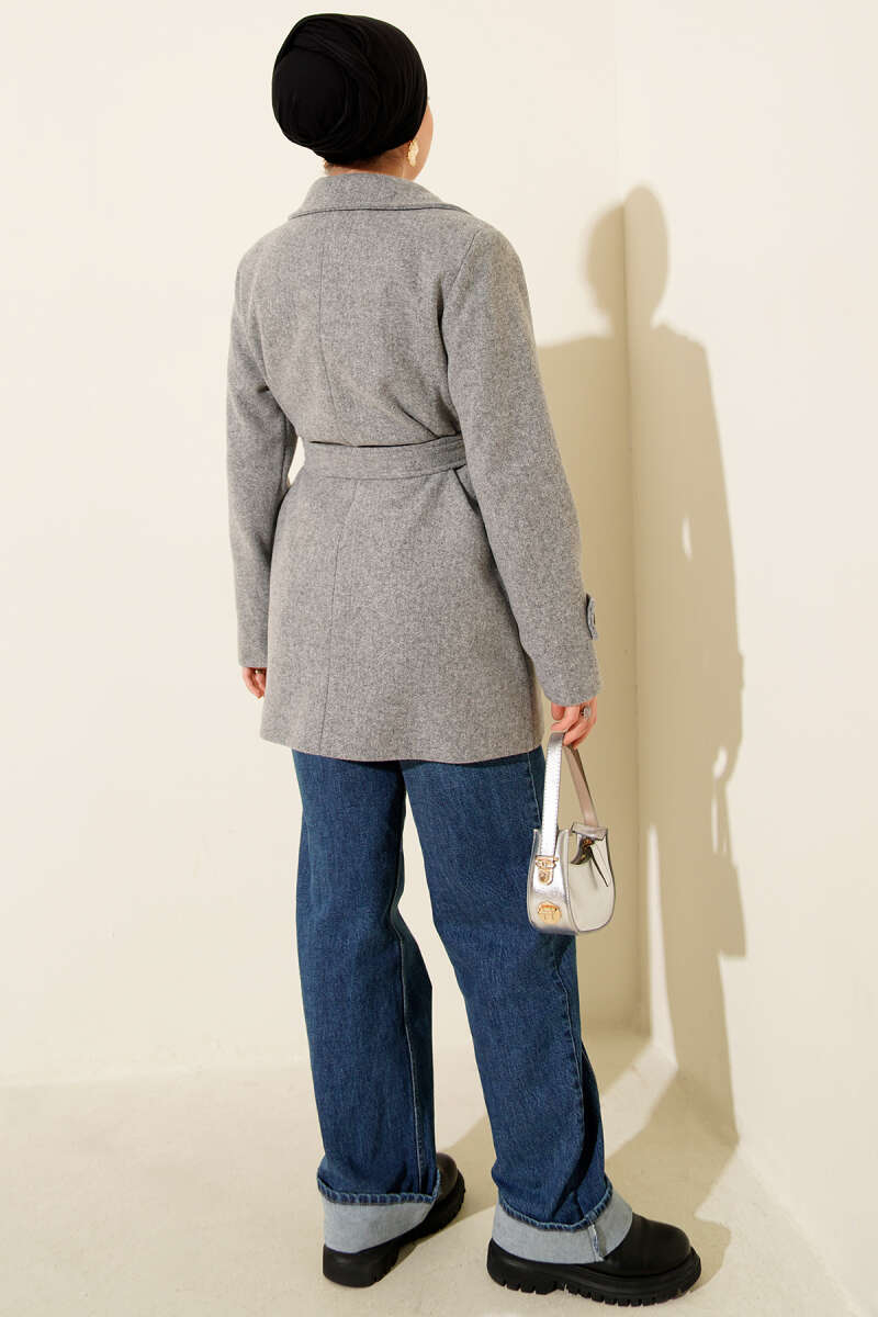 Kuşaklı Kruvaze Yaka Kısa Kaşe Kaban Gri