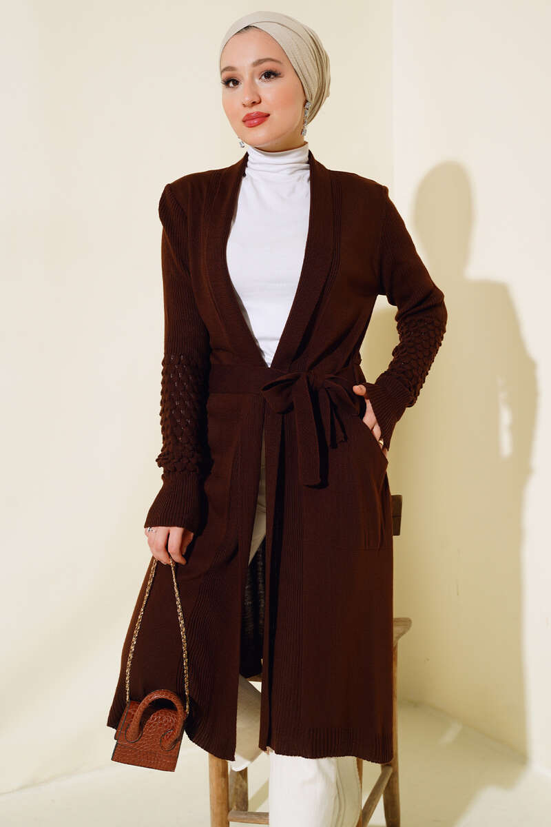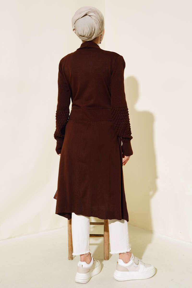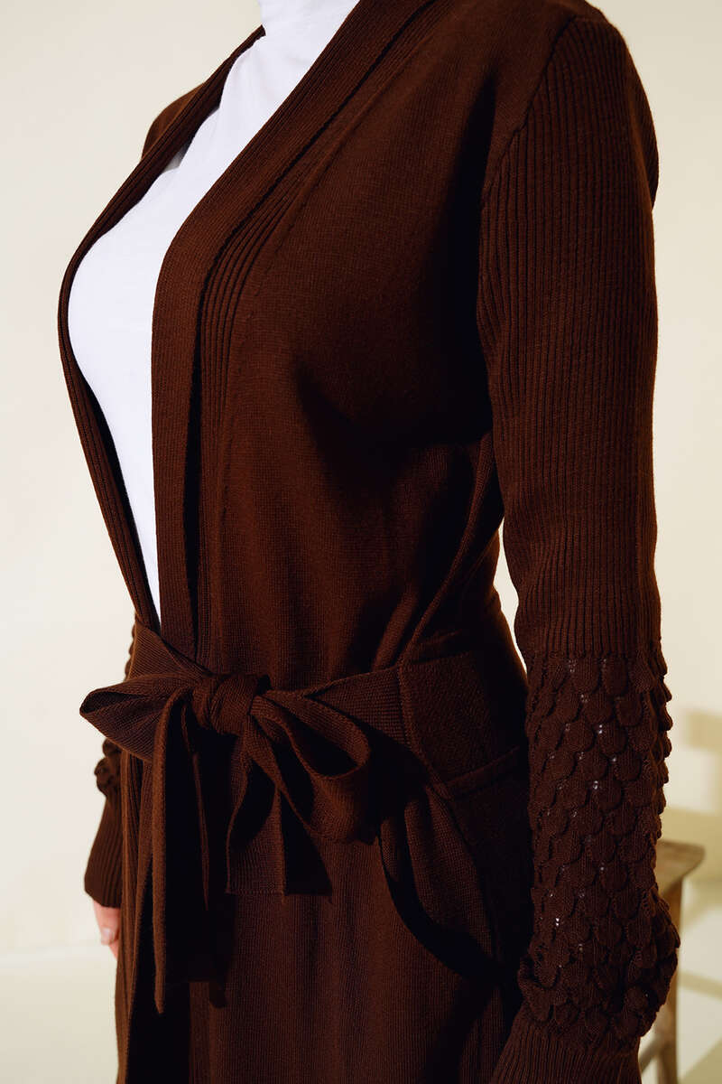 Üzüm Kol Bağcıklı Uzun Hırka Kahve