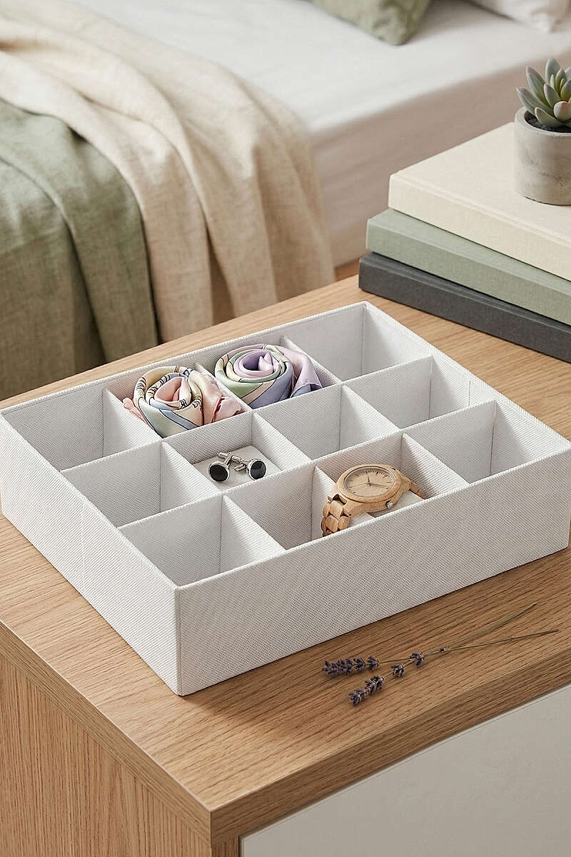Düzenin getirdiği huzuru keşfedin! Kravat, çorap, iç çamaşırı, takı veya şal gibi küçük aksesuarlarınızı kategorize ederek aradığınızı saniyeler içinde bulmanızı sağlayan bu beyaz düzenleyici, çekmecelerinize ferah bir nefes aldırır.