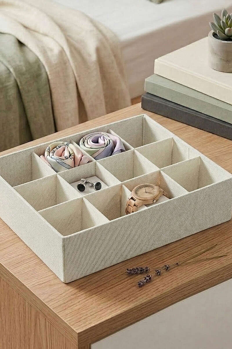 Düzenin getirdiği huzuru keşfedin! Kravat, çorap, iç çamaşırı, takı veya şal gibi küçük aksesuarlarınızı kategorize ederek aradığınızı saniyeler içinde bulmanızı sağlayan bu beyaz düzenleyici, çekmecelerinize ferah bir nefes aldırır.
