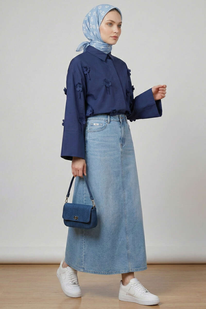 3D Çiçek Aplikeli Gömlek Lacivert