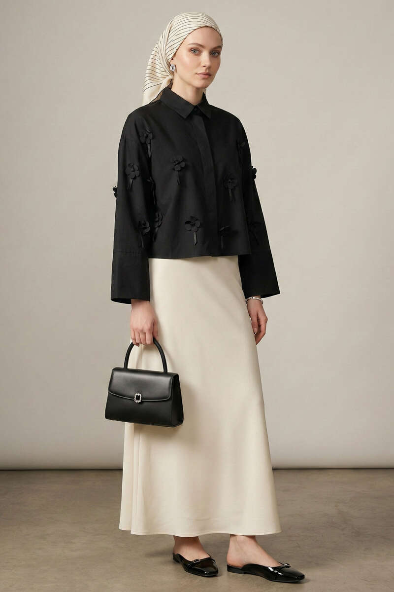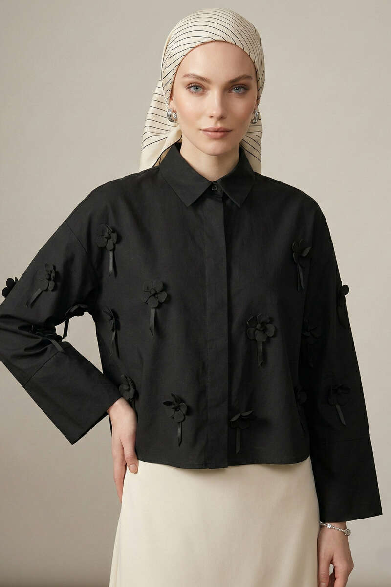 3D Çiçek Aplikeli Gömlek Siyah