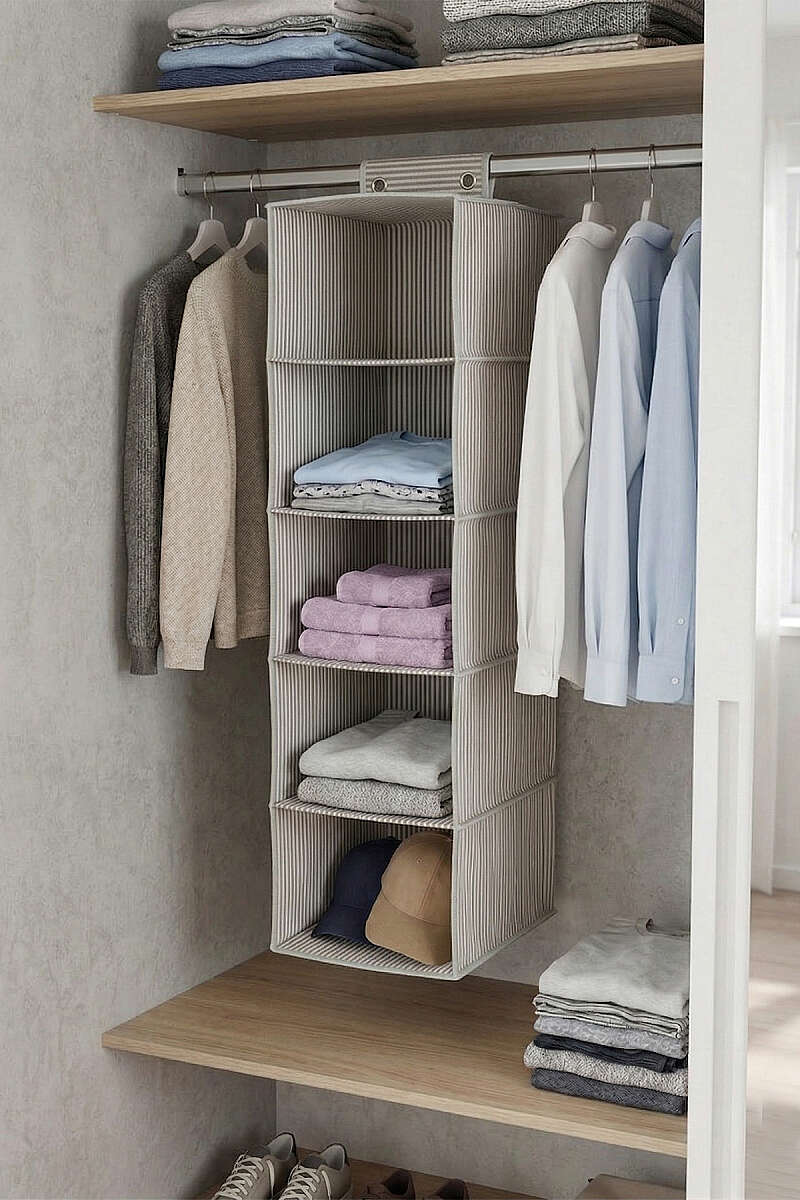 Dolabınızda yer açmanın en şık yolu! Katlanabilir giysileriniz, havlularınız veya çantalarınız için ekstra raf alanı yaratan bu düzenleyici, modern çizgili deseniyle gardırobunuza düzen ve estetik getirir.