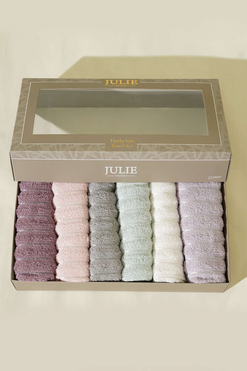 Julie Home Havlu Seti, yüksek kaliteli pamuk ipliklerden üretilmiştir. Yumuşak ve dolgun dokusu sayesinde cildi tahriş etmez. Güçlü emici yapısı ile banyo sonrası konfor sağlar. Pastel renk seçenekleri banyonuza zarif bir hava katar. Şık kutulu ambalajı sayesinde hediye olarak da tercih edilebilir.
