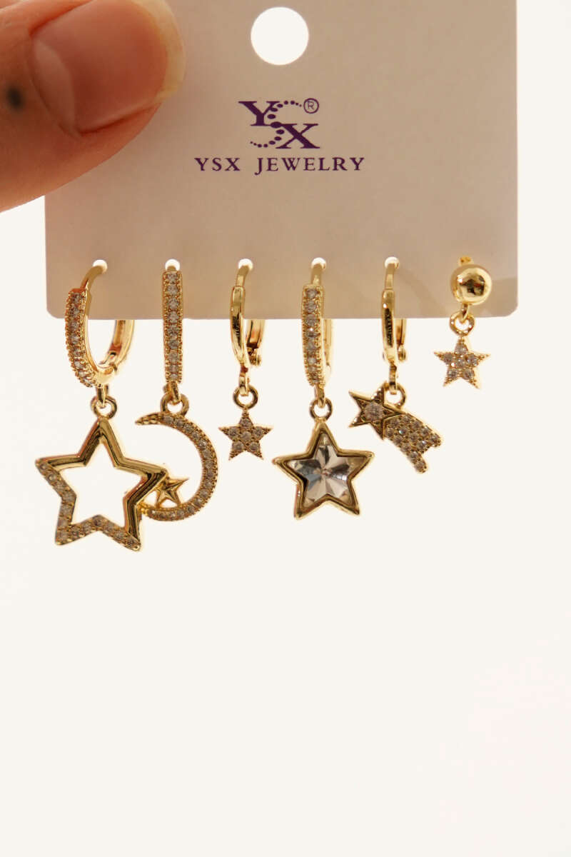 6'Lı Kombin Taşlı Yıldız Figürlü Küpe Gold