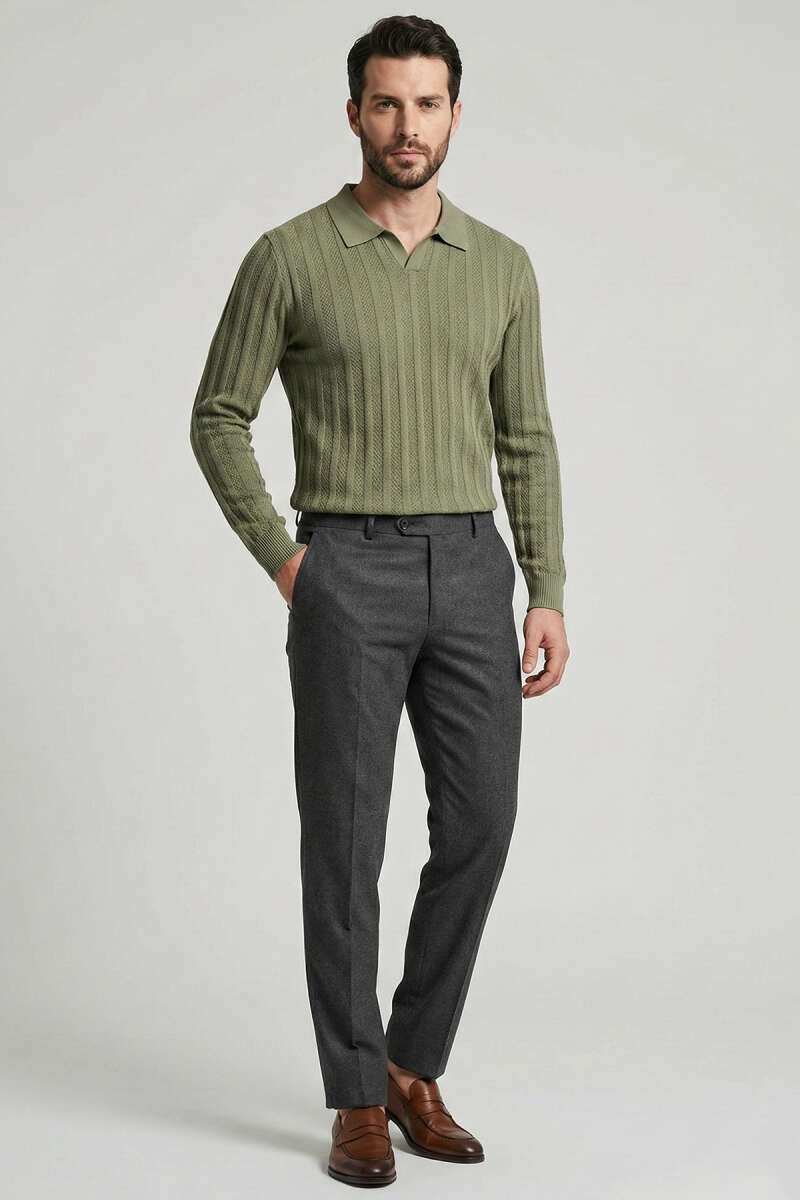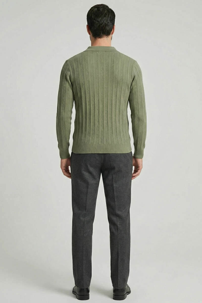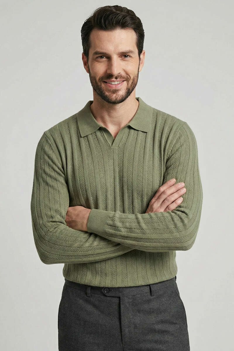Açık Polo Yaka Erkek Örme Kazak Haki