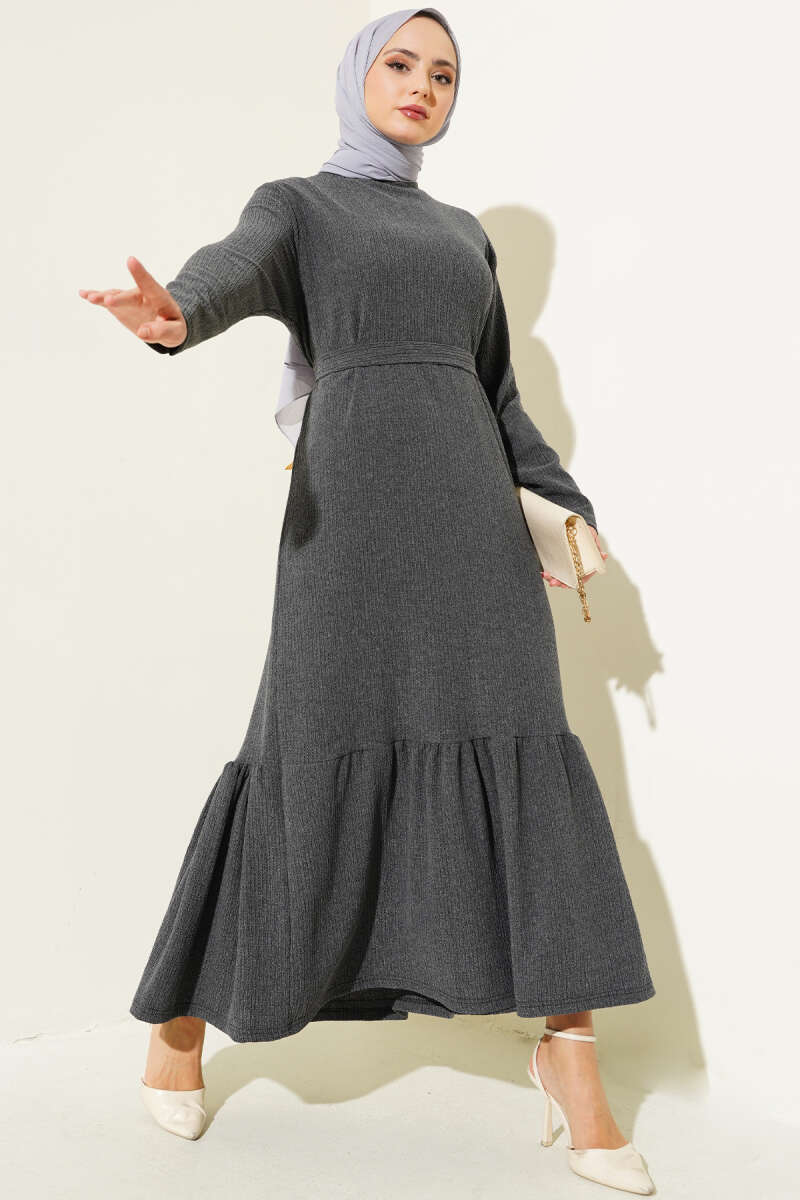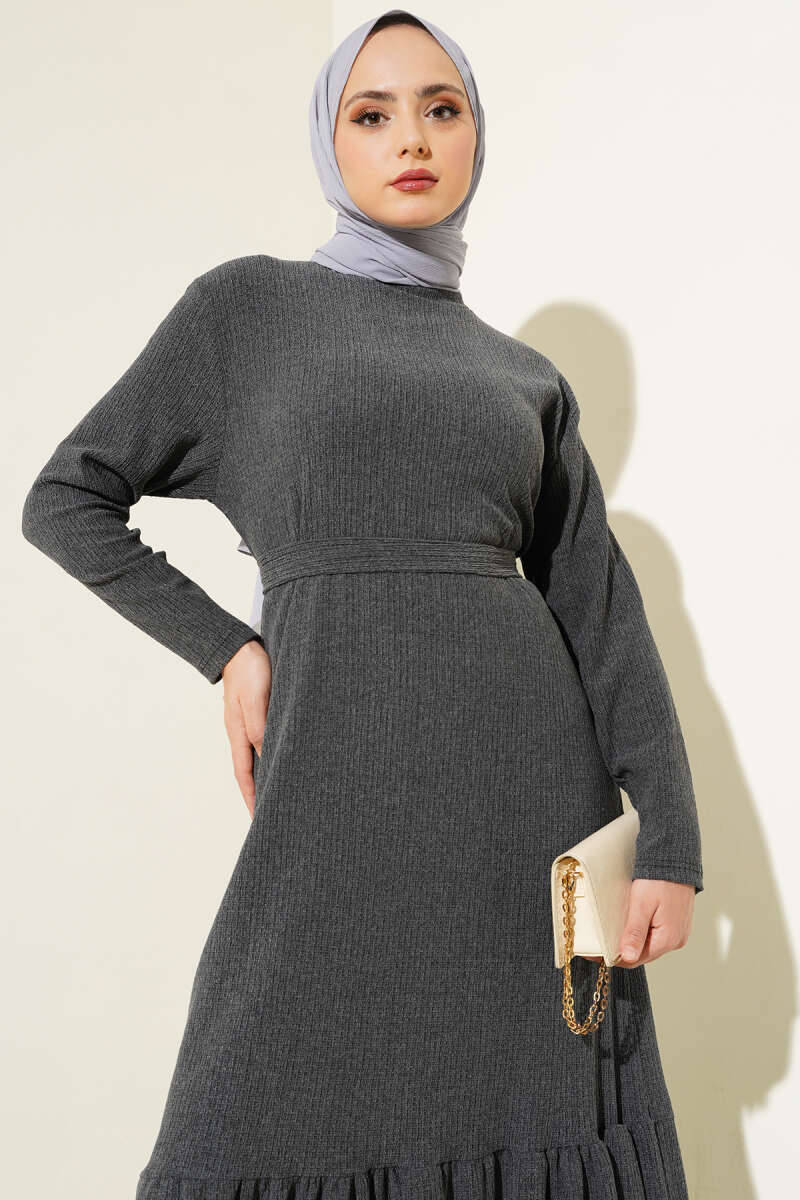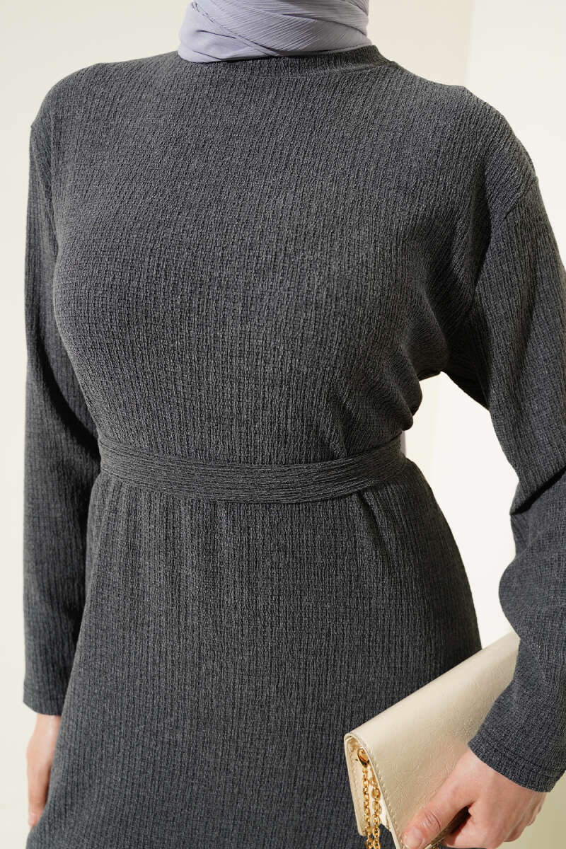 Kuşaklı Ağaç Kabuğu Elbise Antrasit