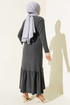 Yatay Çizgili Balıkçı Yaka Triko Elbise Füme