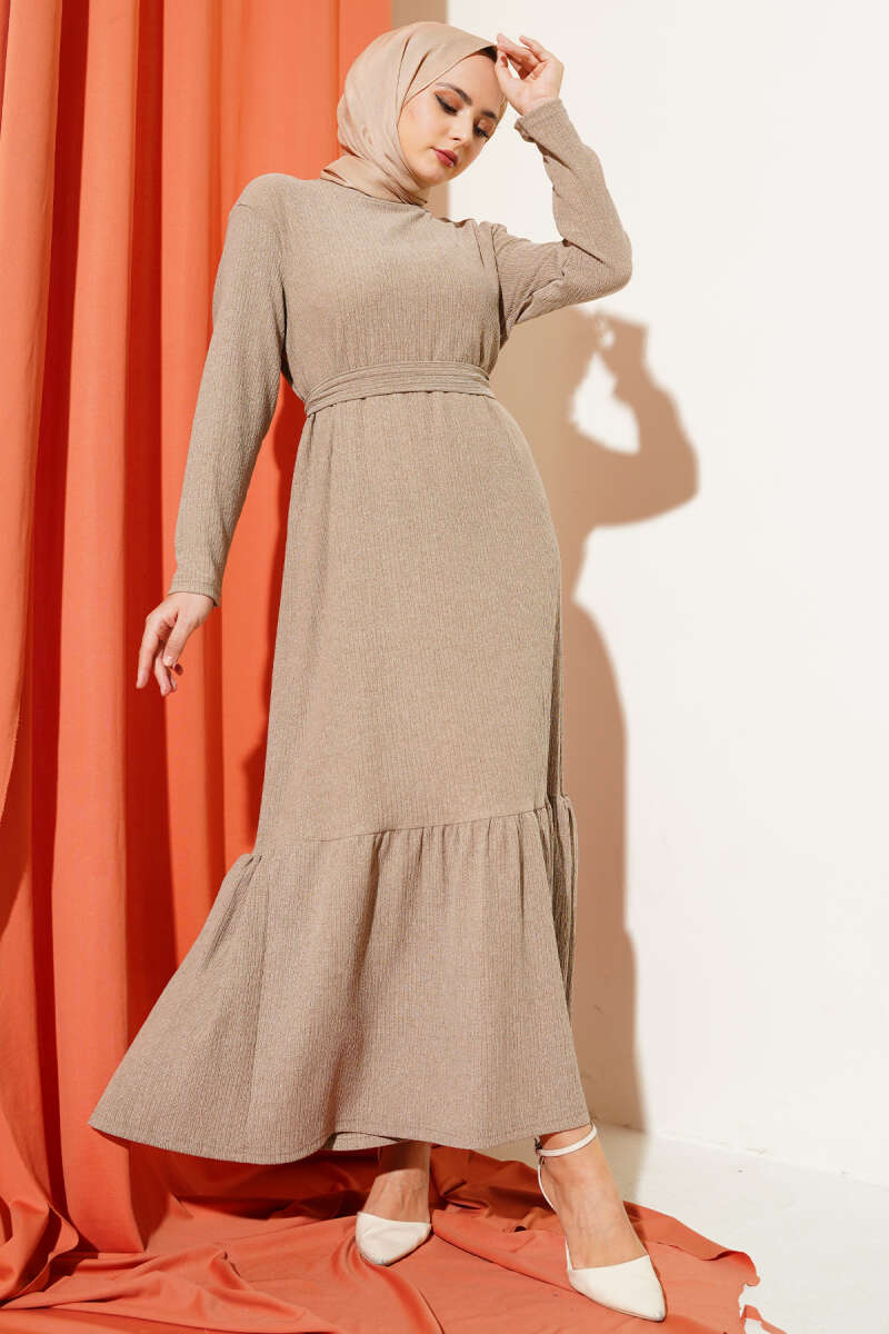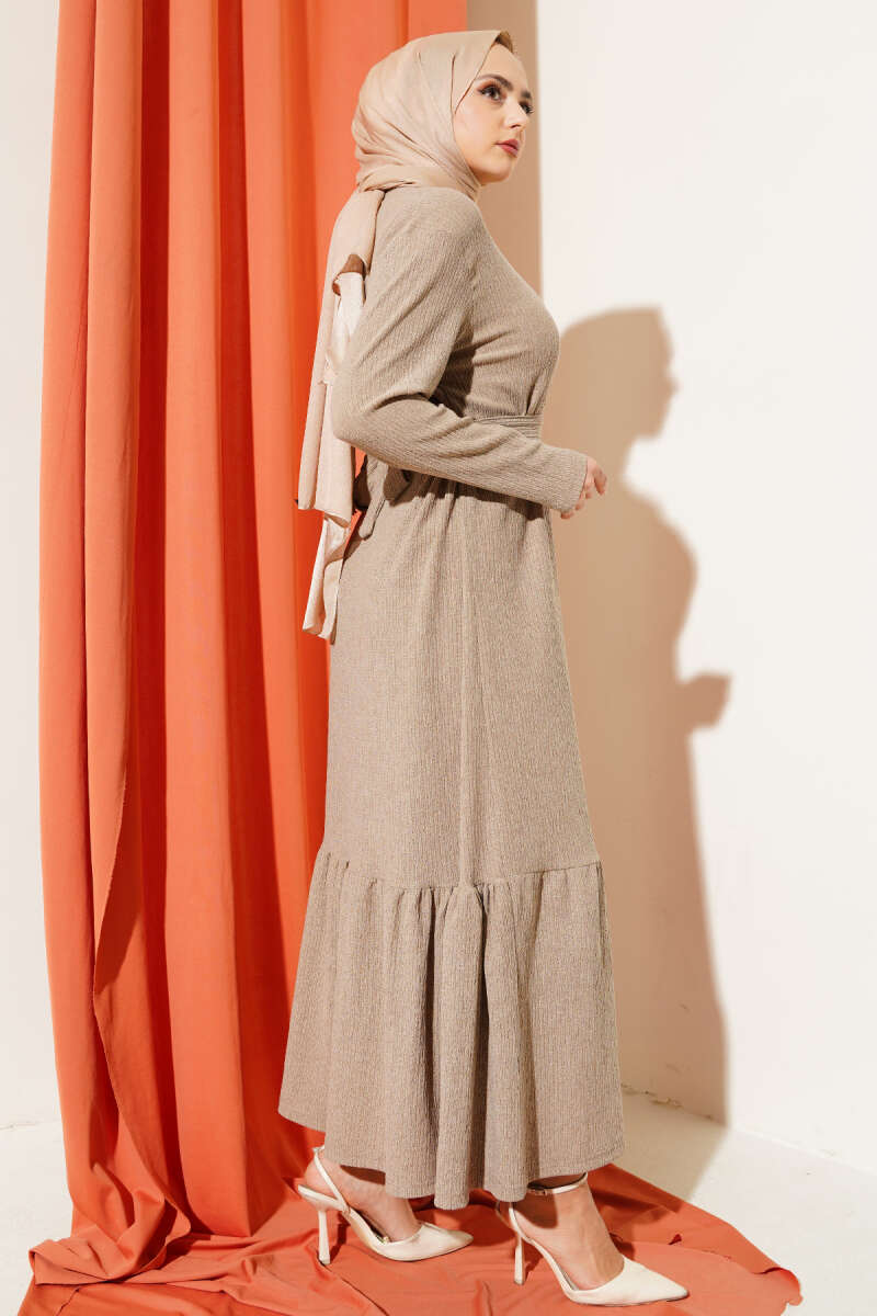 Kuşaklı Ağaç Kabuğu Elbise Sütlü Kahve