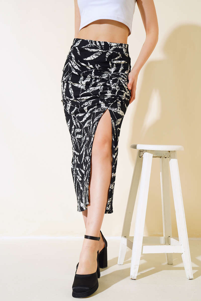 Yeni sezon etek modelimiz sizlerle beraber. Midi boy etek modelimiz yırtmaçlıdır. İddialı tarzıyla dikkatleri üzerine çeken etek modelimiz ağaç kabuğu desenlidir. Yırtmaçtan yukarı büzgülüdür. Kombinlerinizin yıldız parçası olacak etek modelimiz dolaplarınızda yerlerinizi beklemektedir.