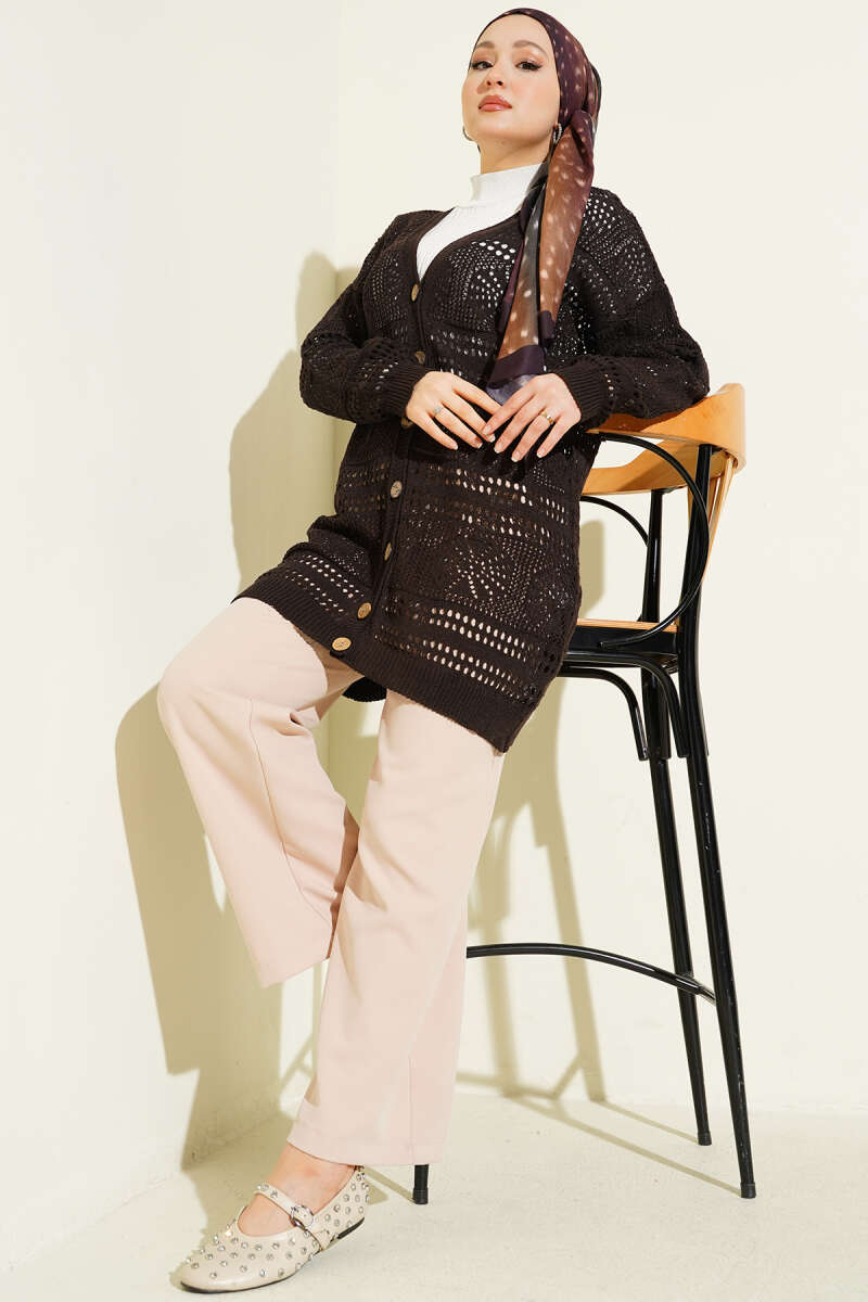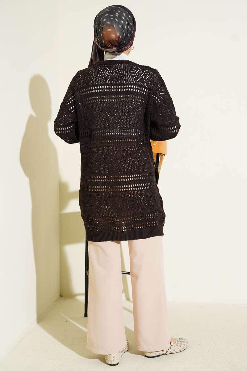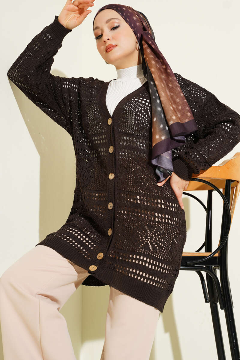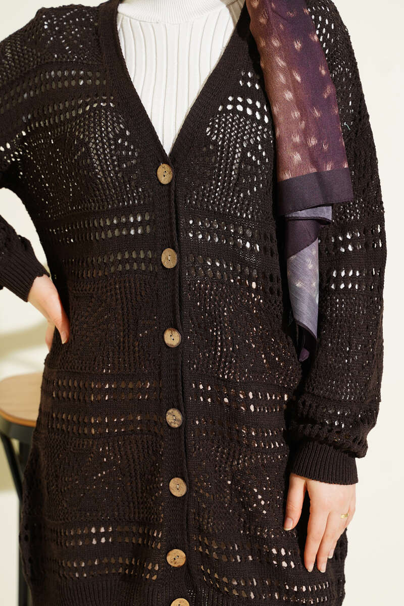 Ahşap Düğmeli Ajurlu Triko Hırka Acı Kahve