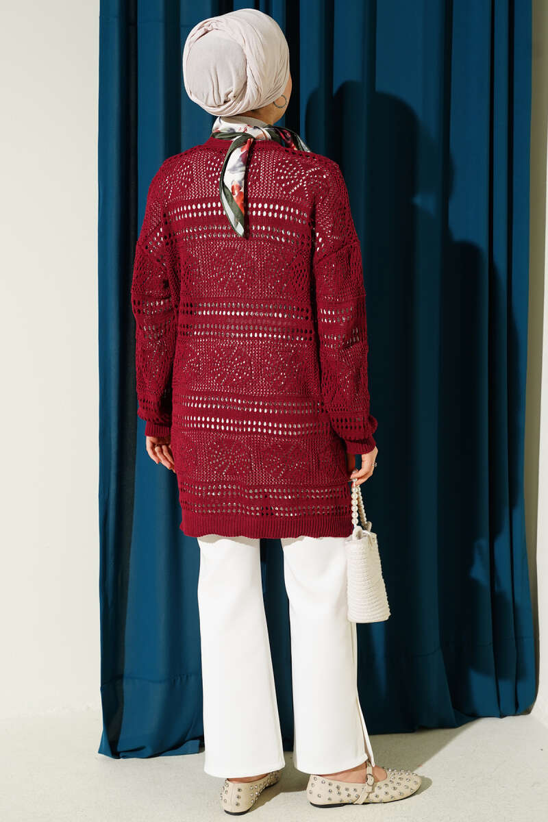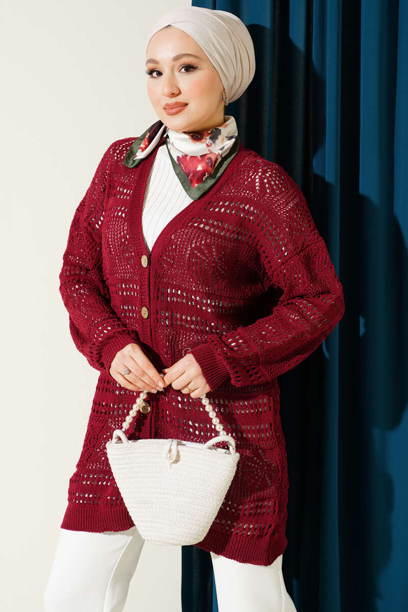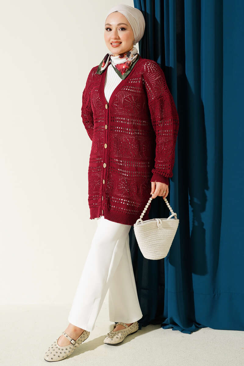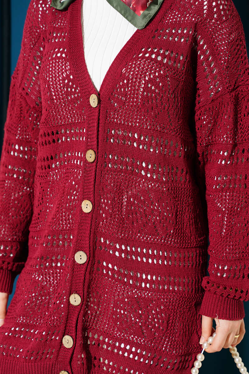 Ahşap Düğmeli Ajurlu Triko Hırka Bordo