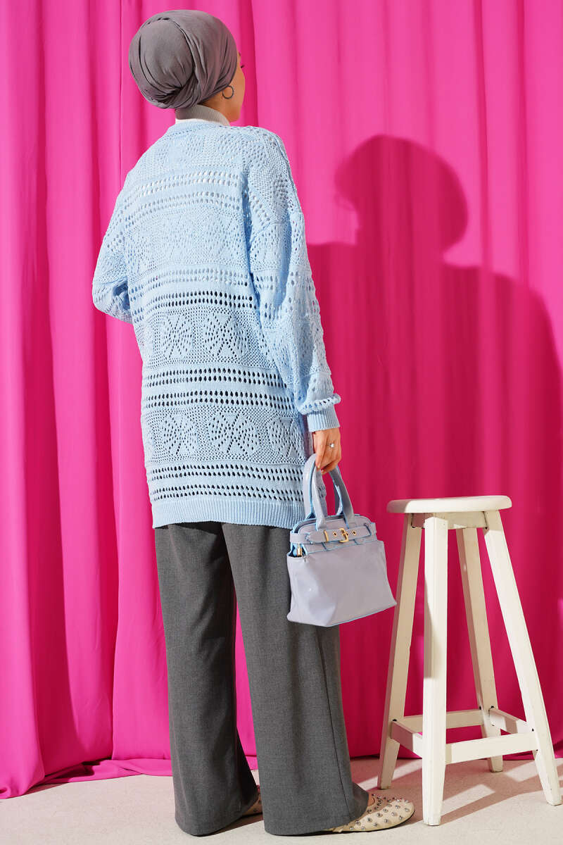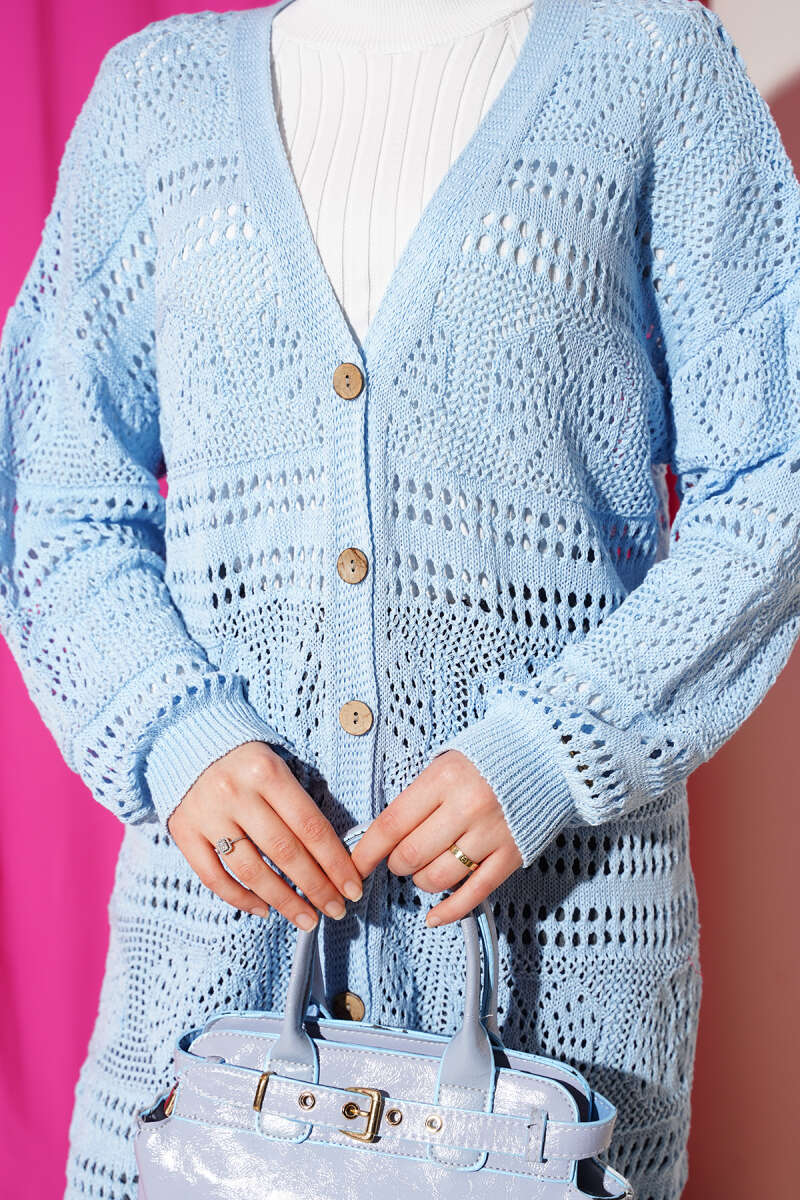 Ahşap Düğmeli Ajurlu Triko Hırka Mavi