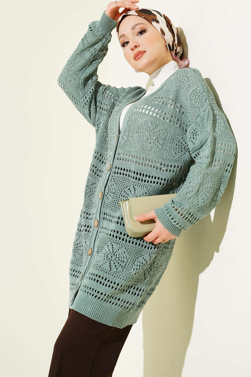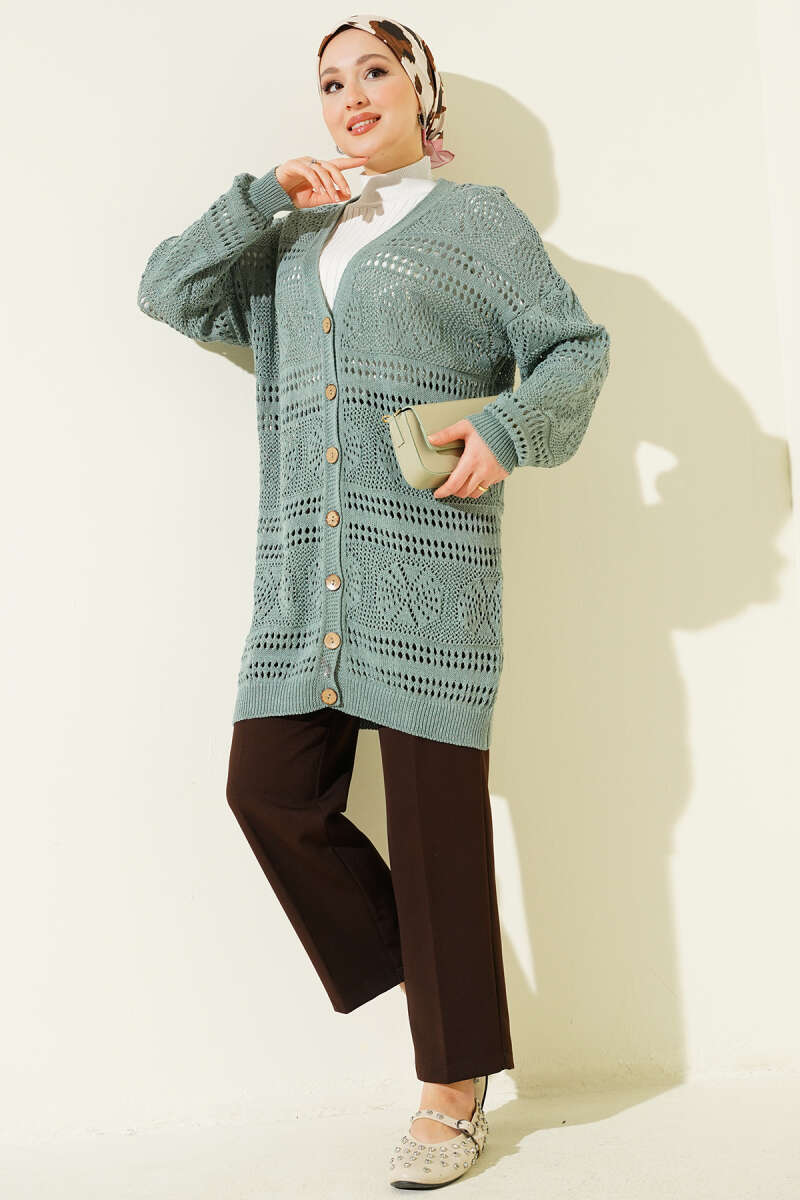Ahşap Düğmeli Ajurlu Triko Hırka Mint