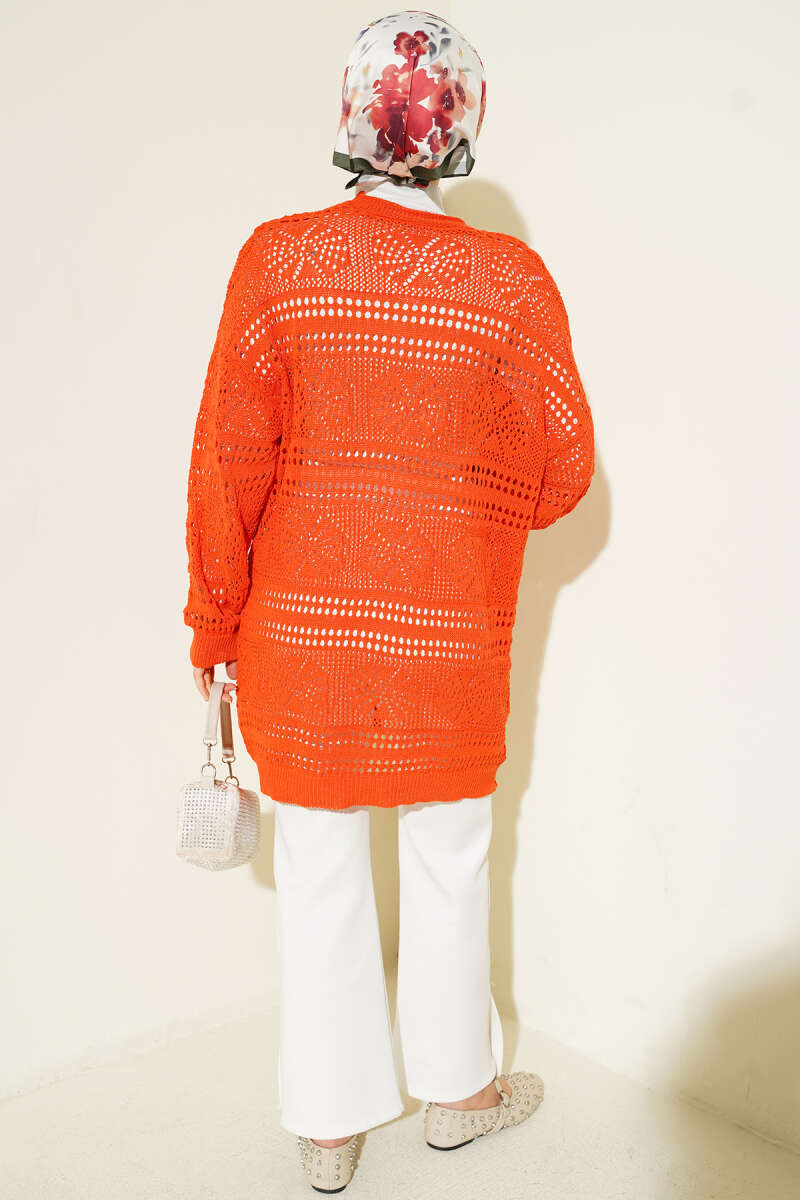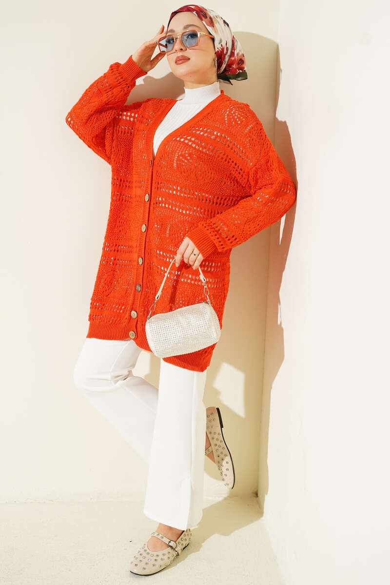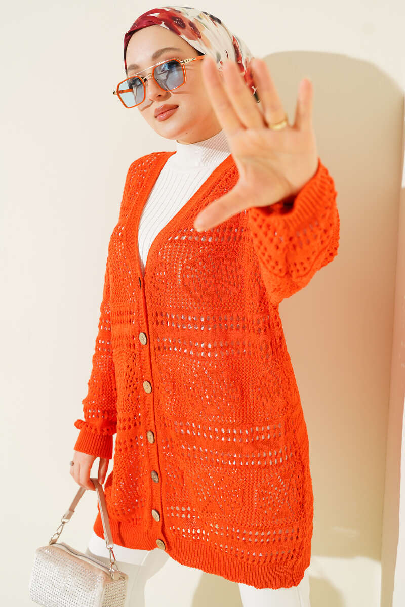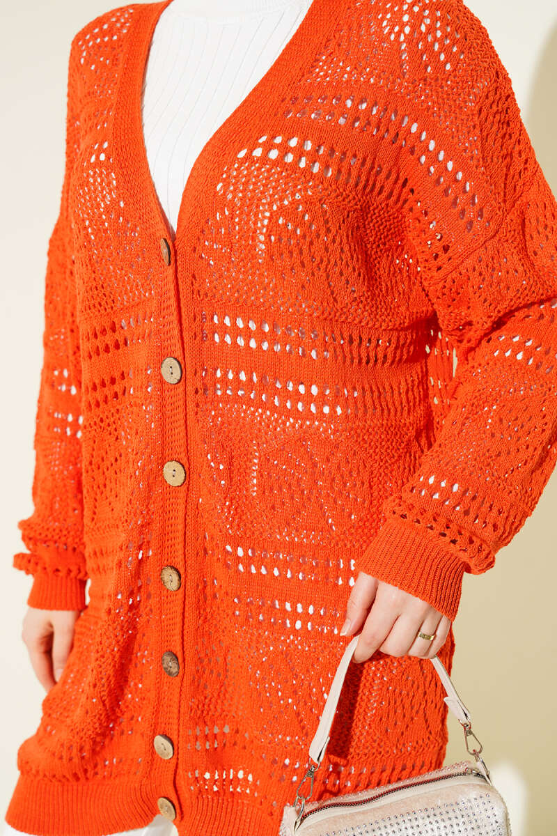 Ahşap Düğmeli Ajurlu Triko Hırka Oranj