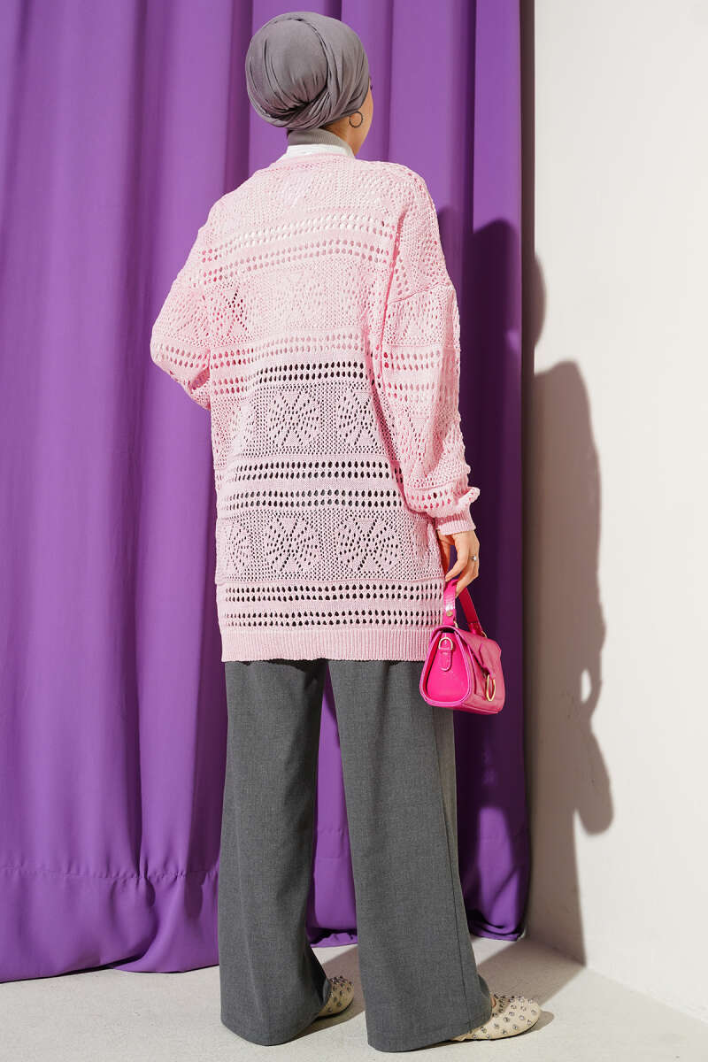 Ahşap Düğmeli Ajurlu Triko Hırka Pembe