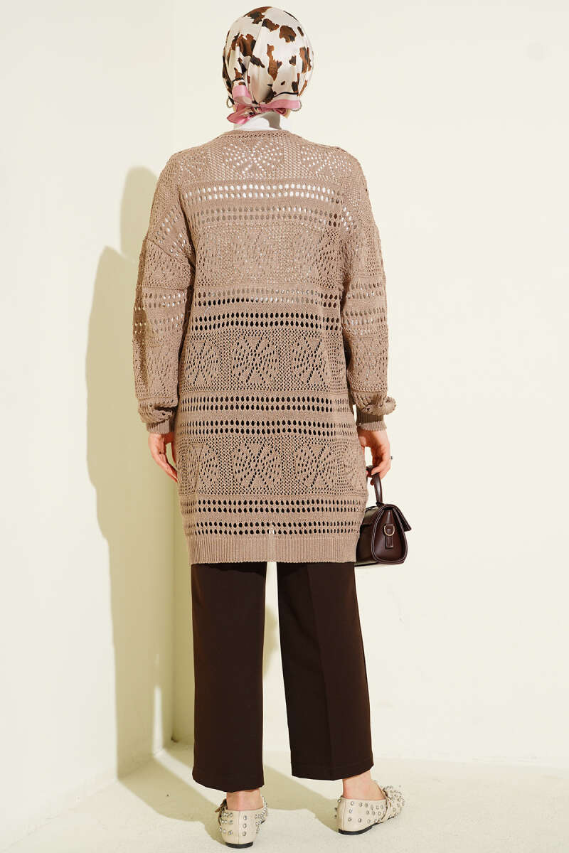 Ahşap Düğmeli Ajurlu Triko Hırka Vizon