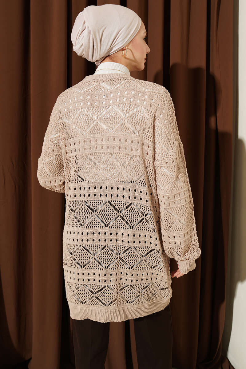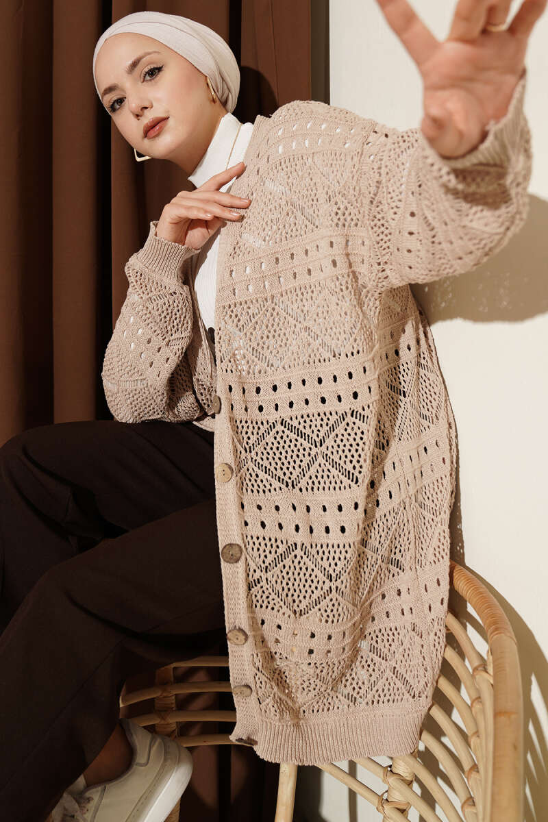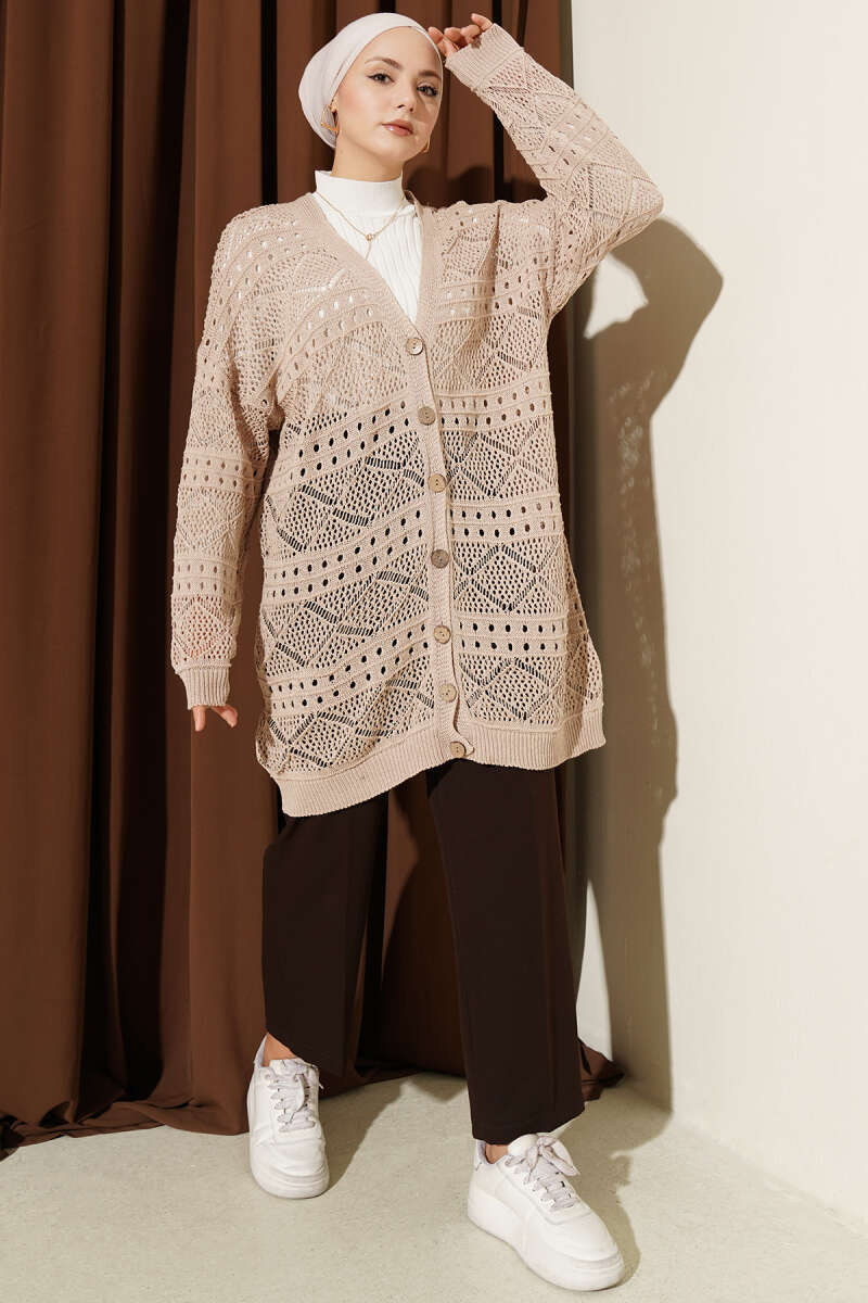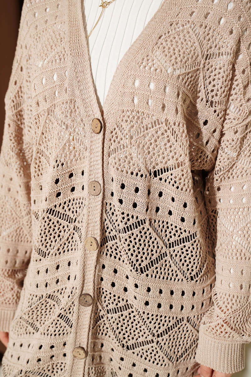 Ahşap Düğmeli Araboy Ajurlu Triko Hırka Bej