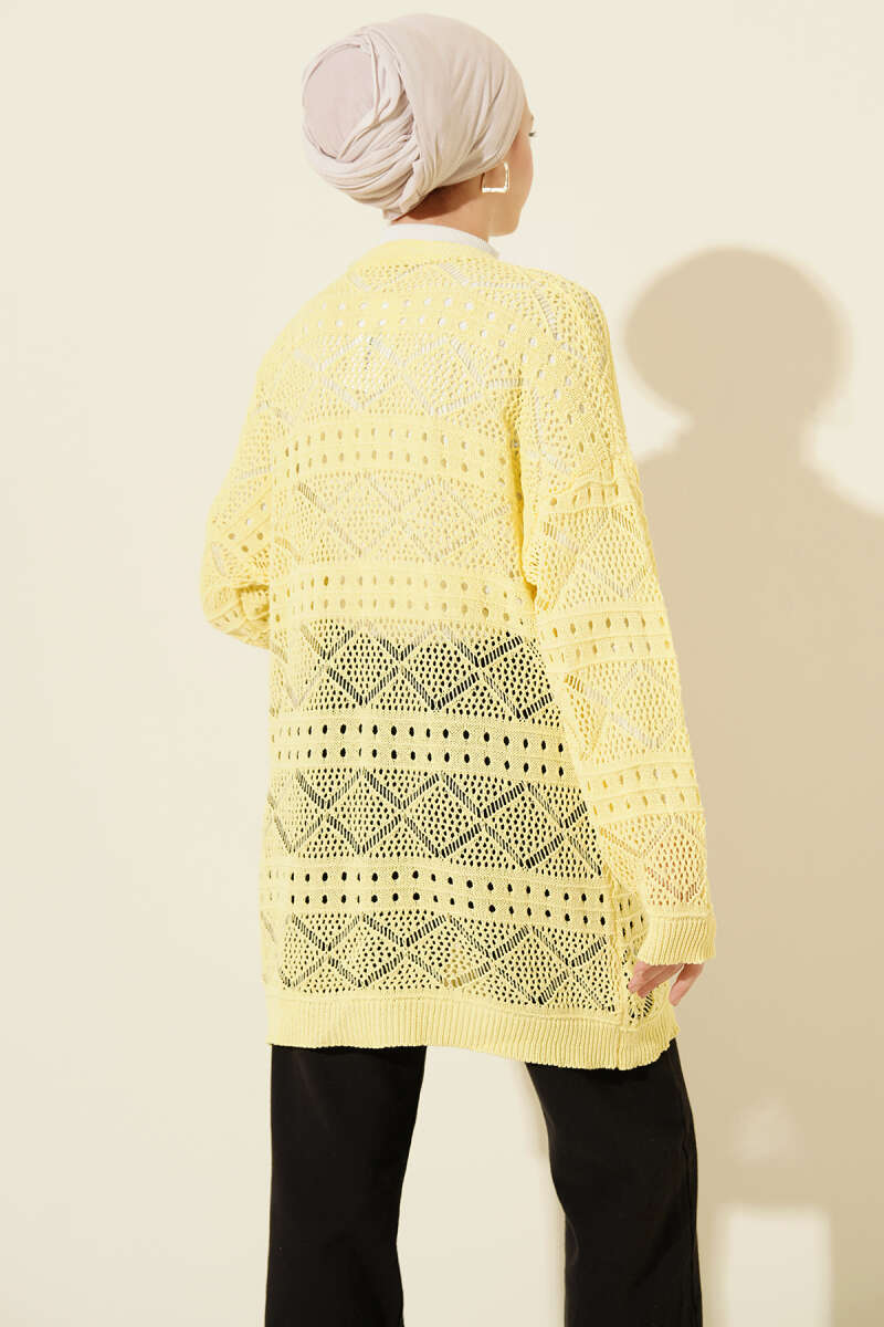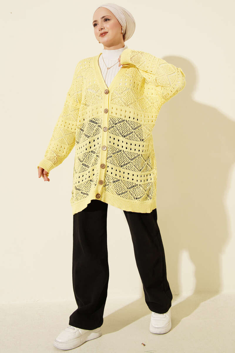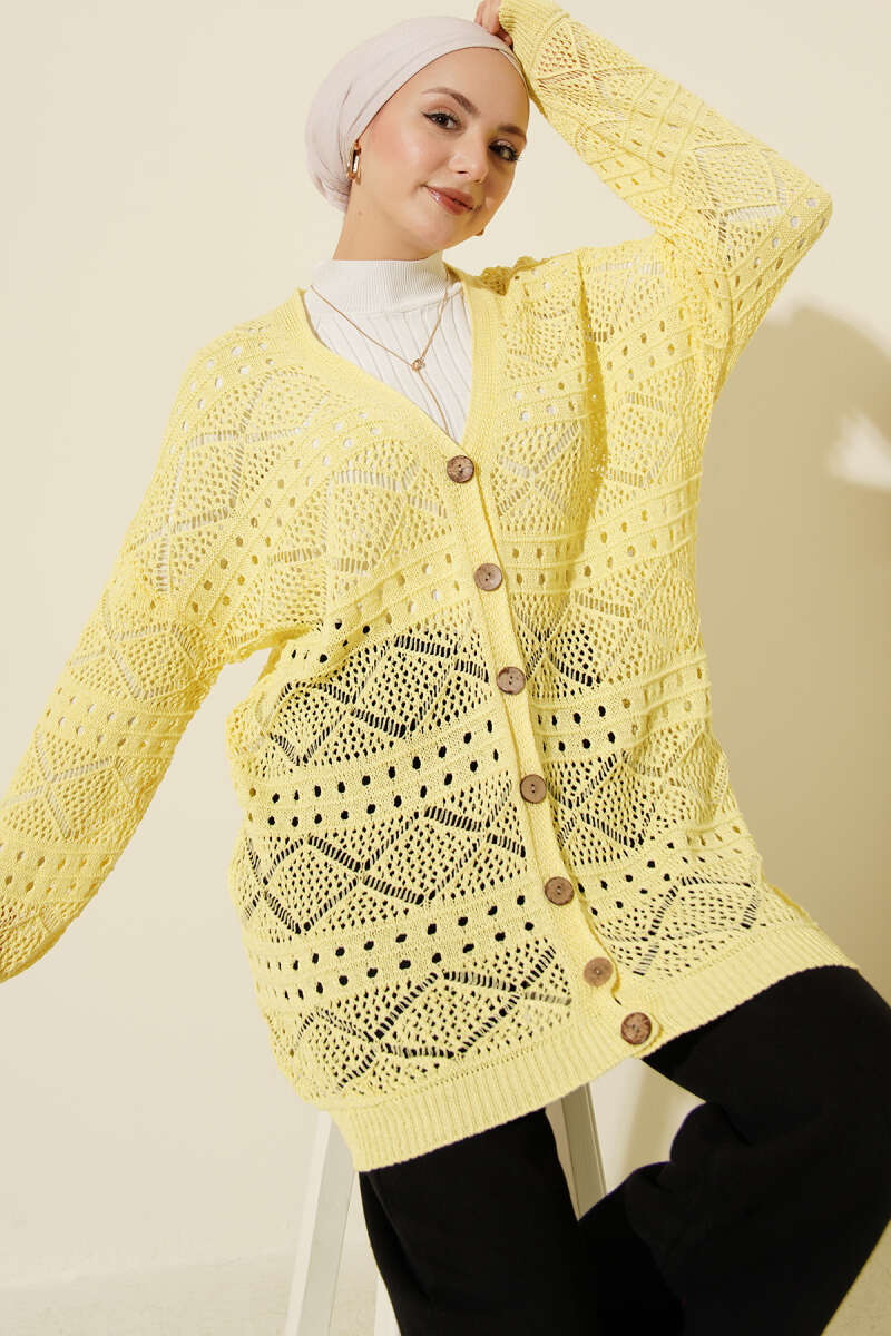 Ahşap Düğmeli Araboy Ajurlu Triko Hırka Sarı