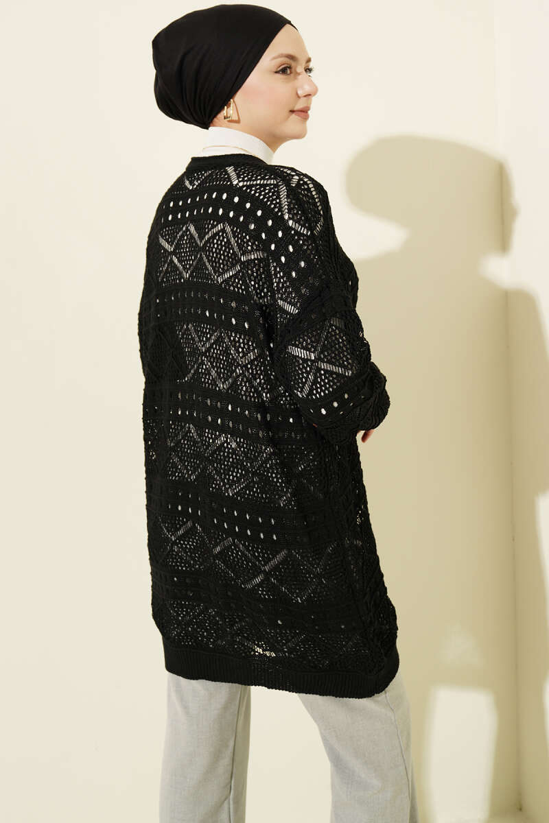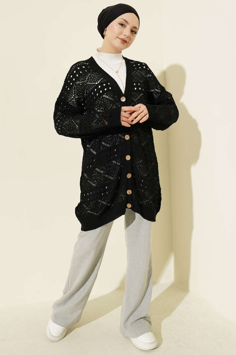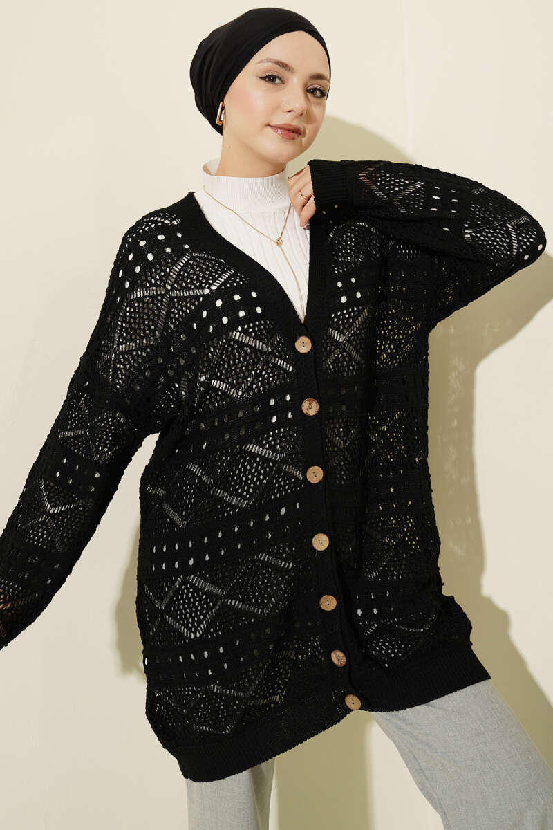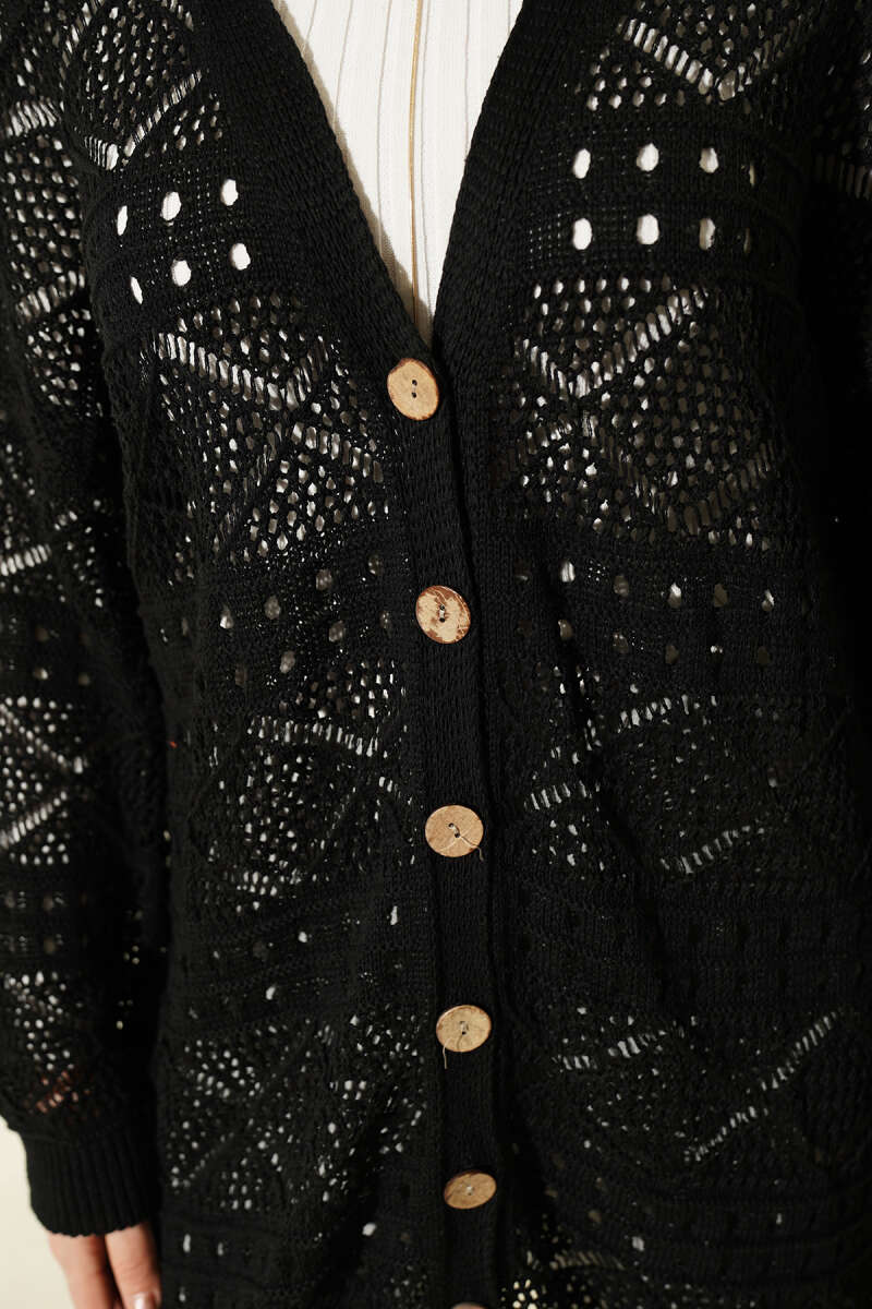 Baklava Desen Düğmeli Triko Hırka Siyah