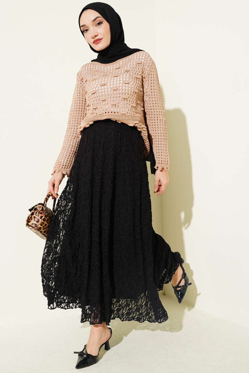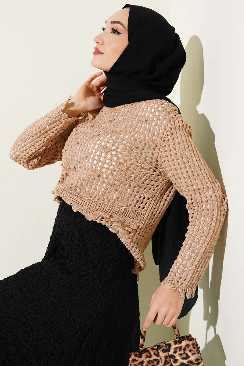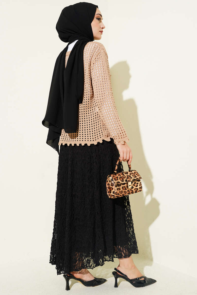 Etek ucundaki ve manşetlerindeki hafif dalgalı kesim, tasarıma romantik bir hava katarken modern kesimiyle gün boyu konforlu bir kullanım sağlar. Nefes alabilen delikli yapısı sayesinde farklı mevsimlerde katmanlı kombinler yapmaya olanak tanıyan bu parça, gardırobunuza sofistike bir dokunuş ekler.