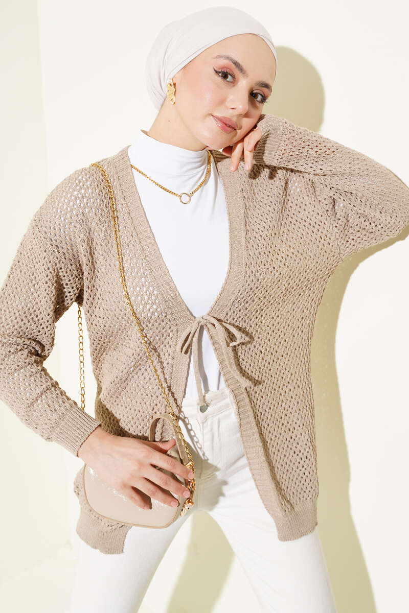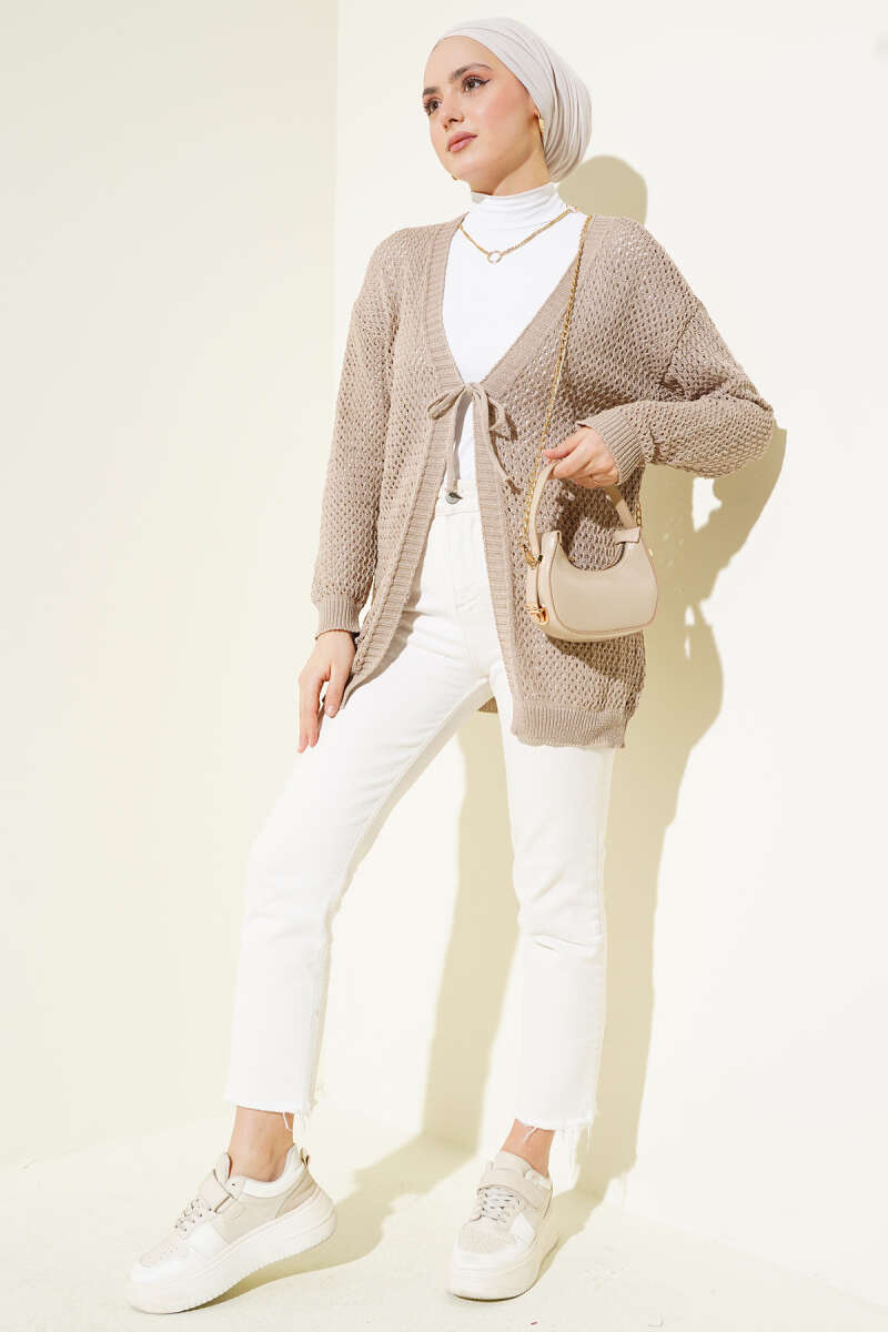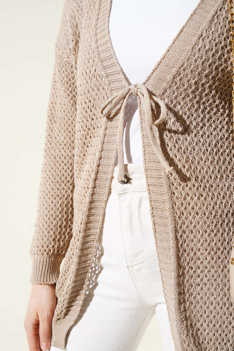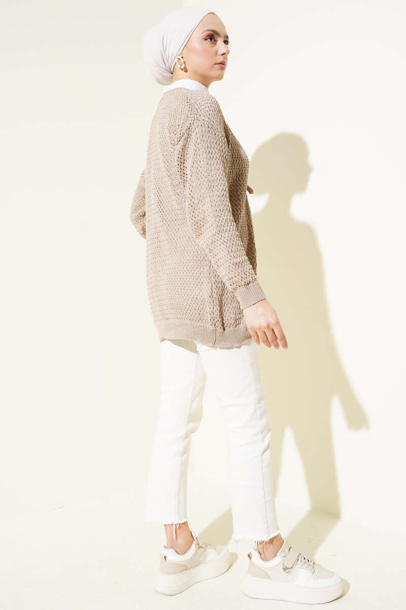 V Yaka Fitilli Çizgili Triko Tunik Kahve