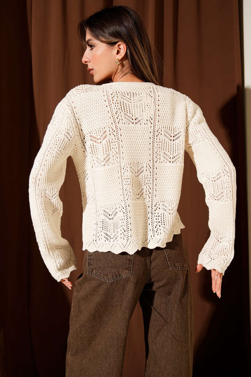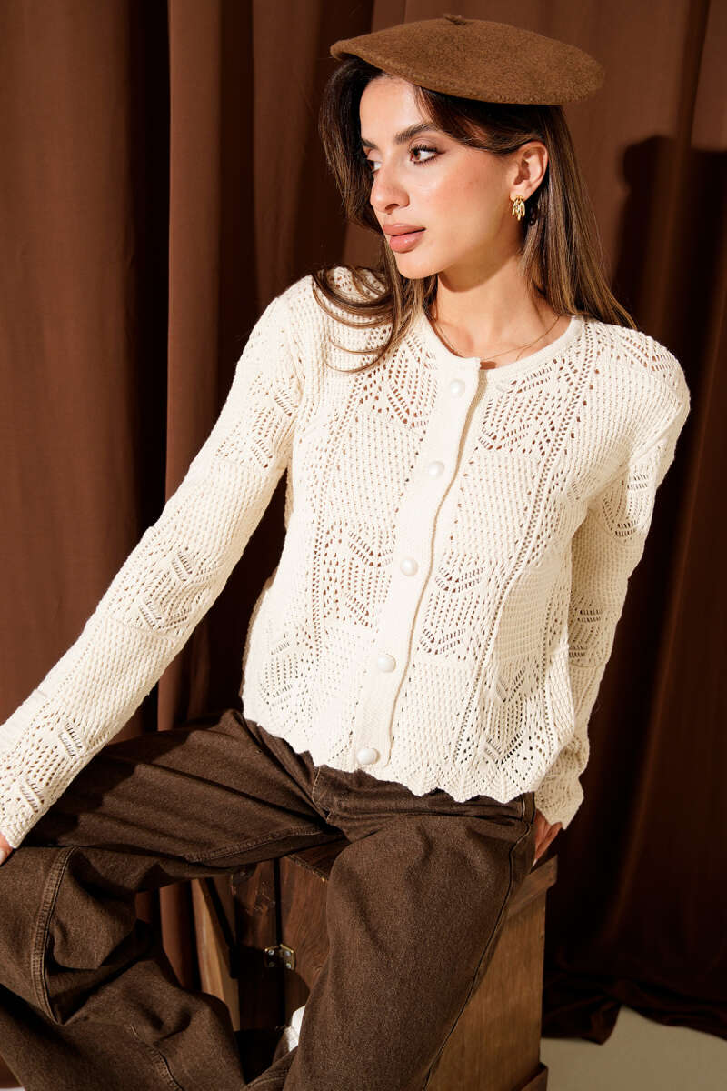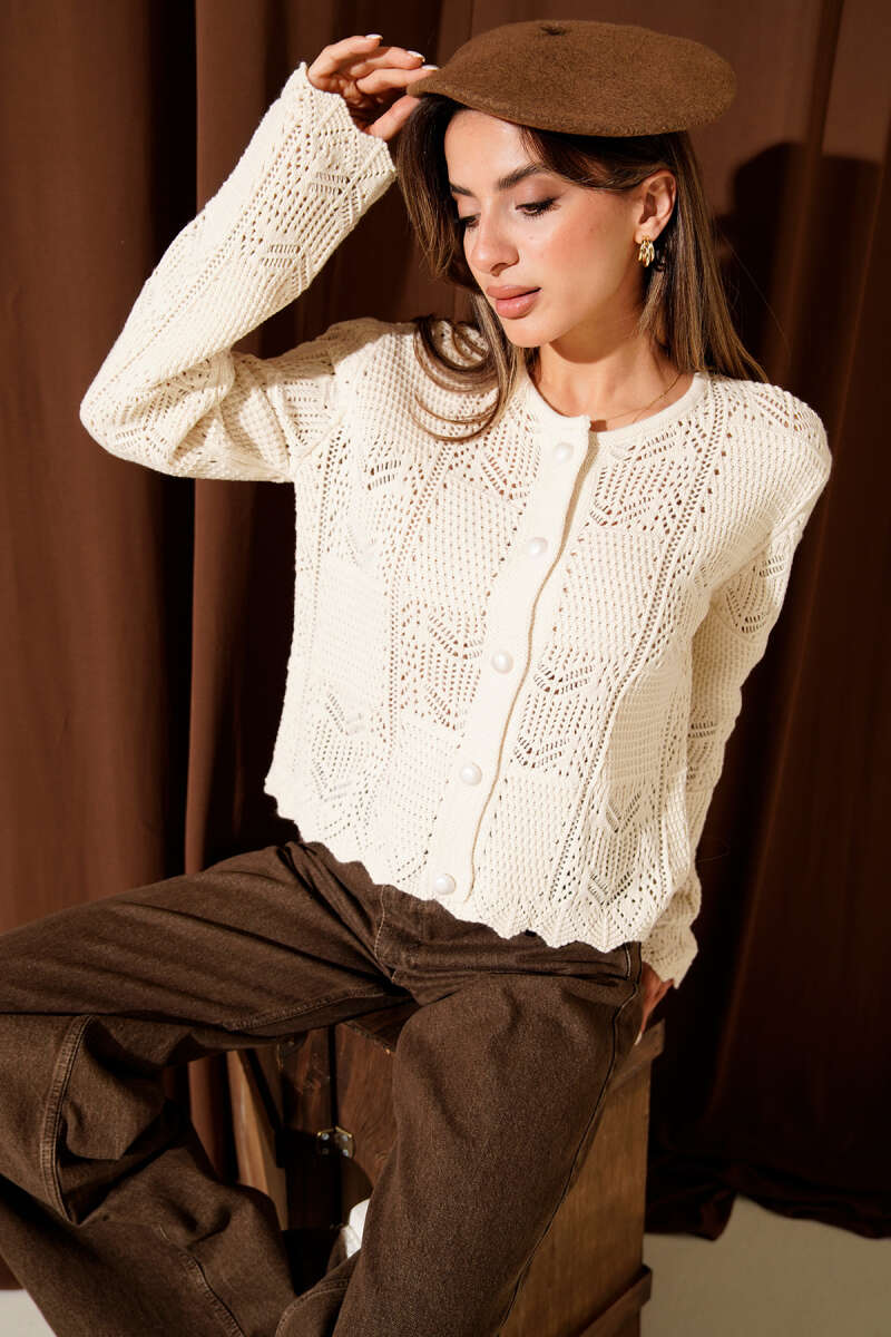 Ajurlu Top Düğmeli Triko Hırka Bej
