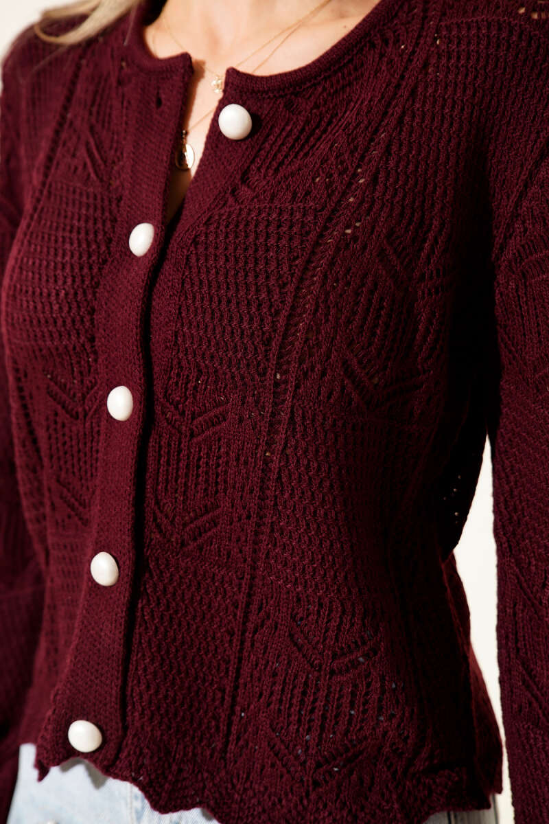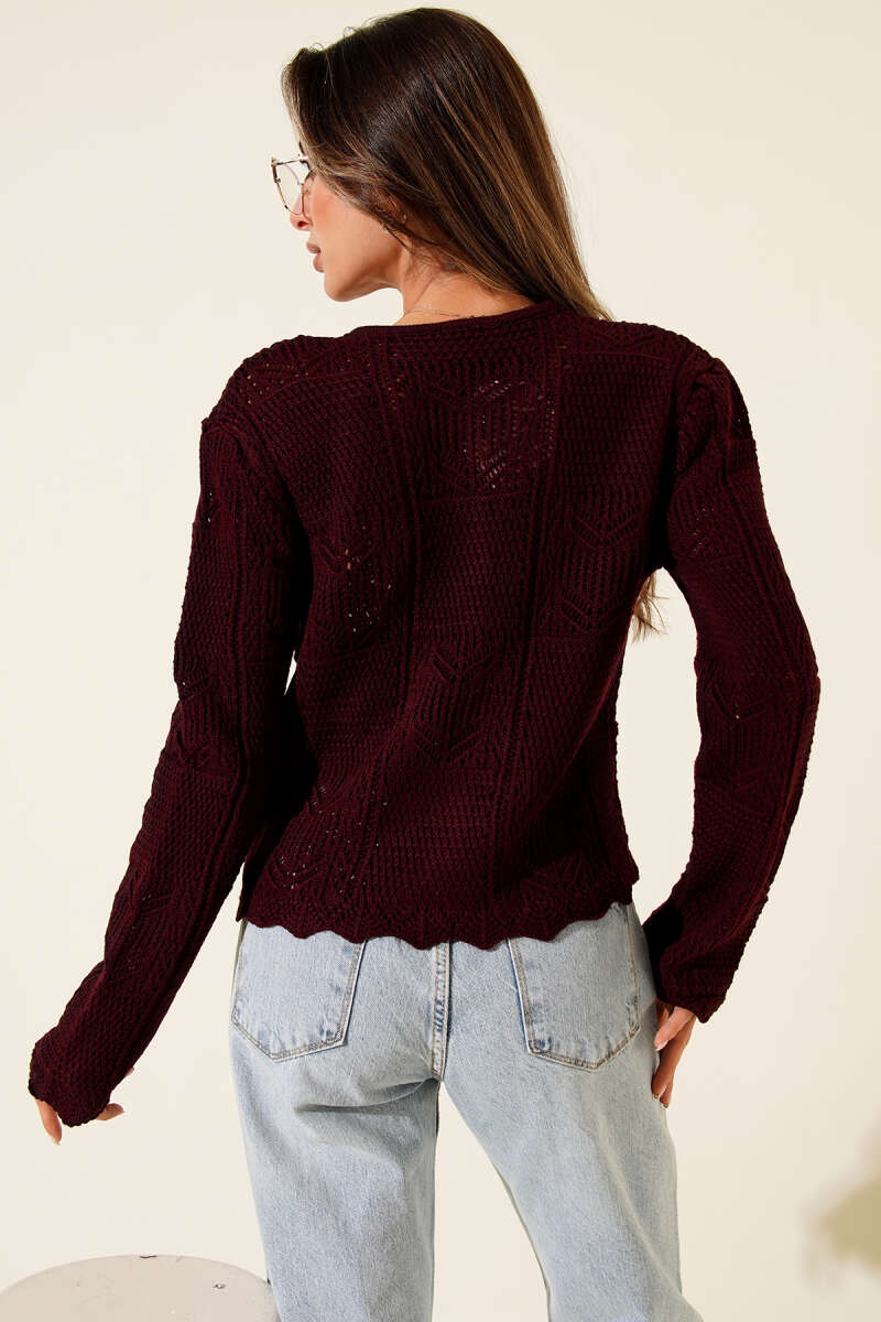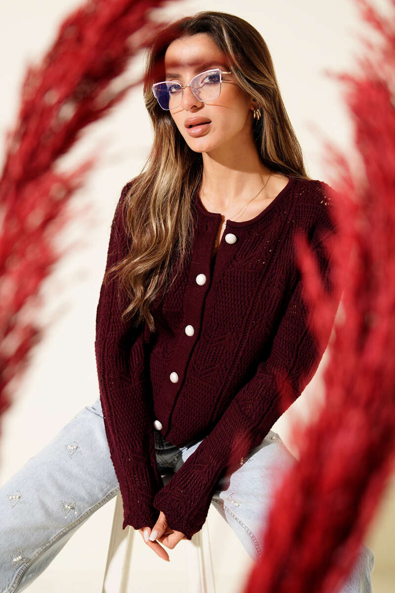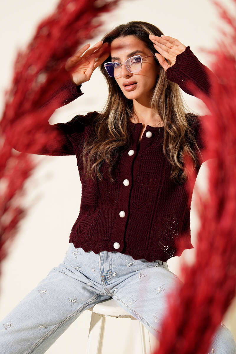 Ajurlu Top Düğmeli Triko Hırka Mürdüm