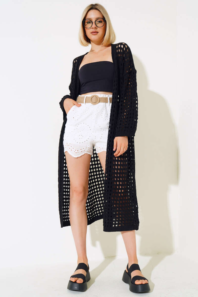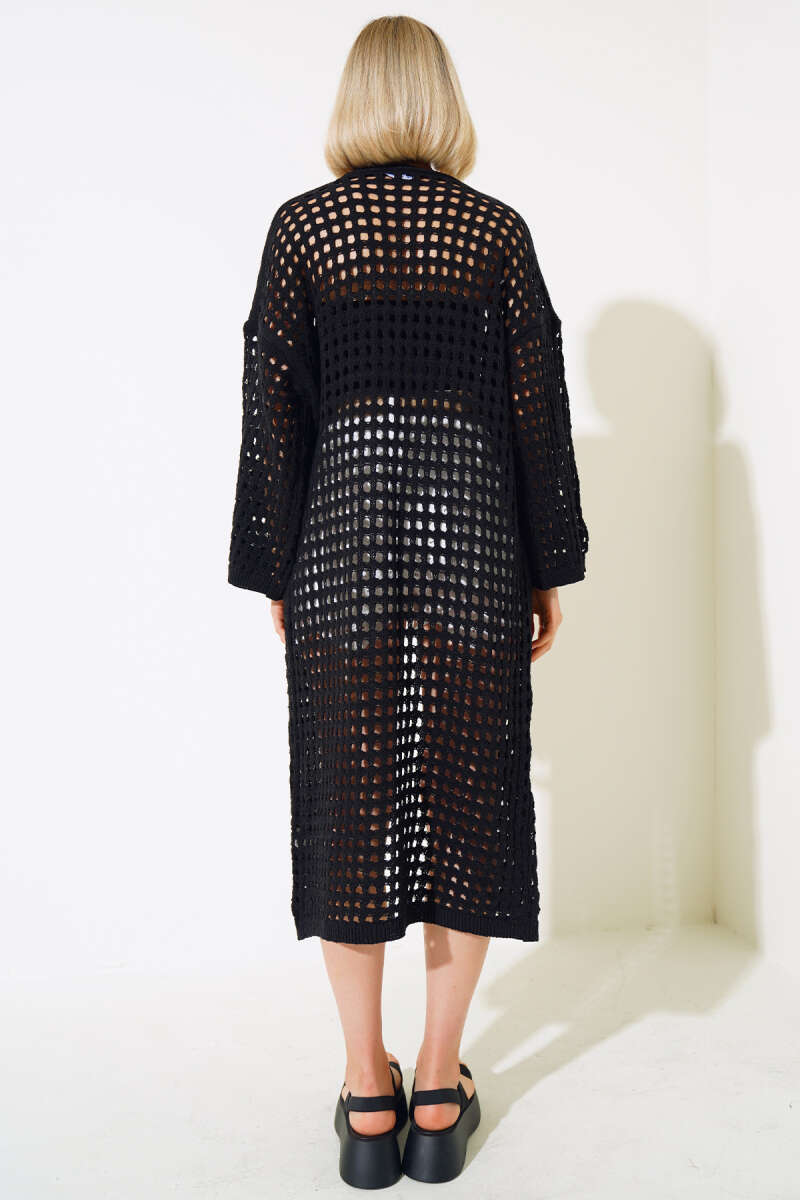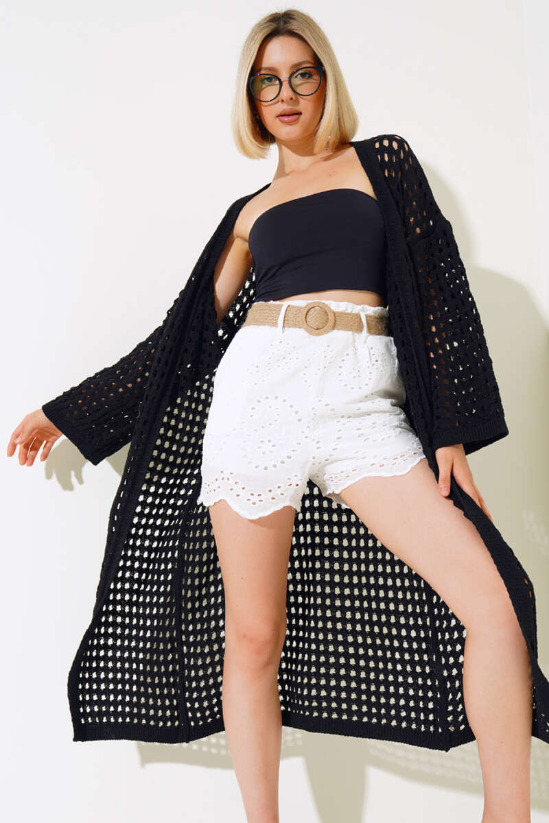 Deri Biyeli Fitilli Görünümlü Kimono Siyah