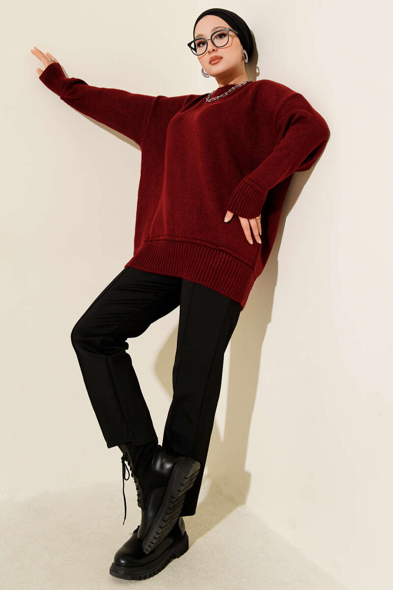 Asimetrik Kabartma Çizgili Triko Tunik Bordo