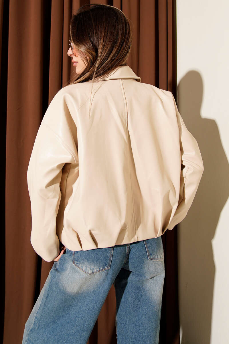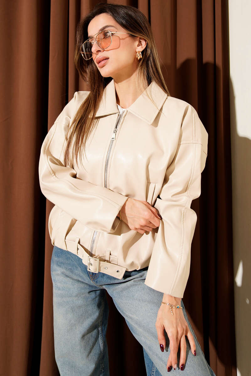 Alt Kemer Tokalı Fermuarlı Deri Ceket Bej
