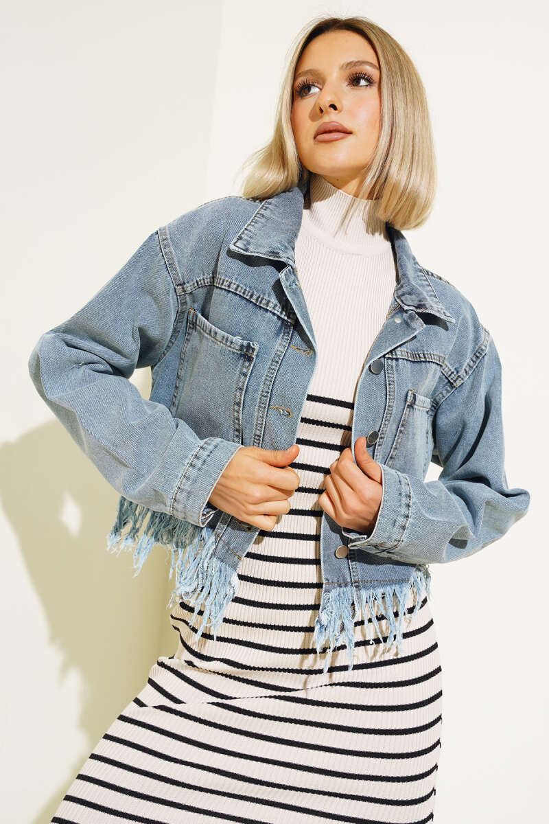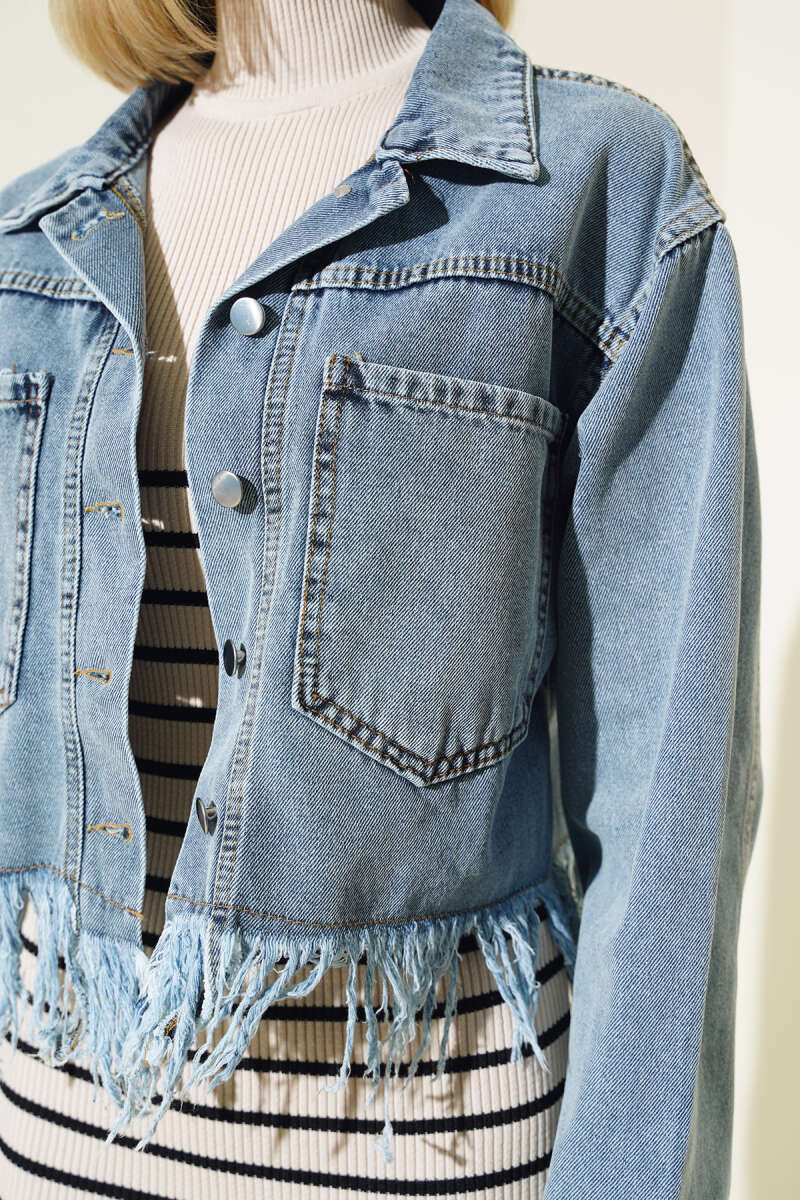 Altı Püsküllü Kısa Kot Ceket Mavi