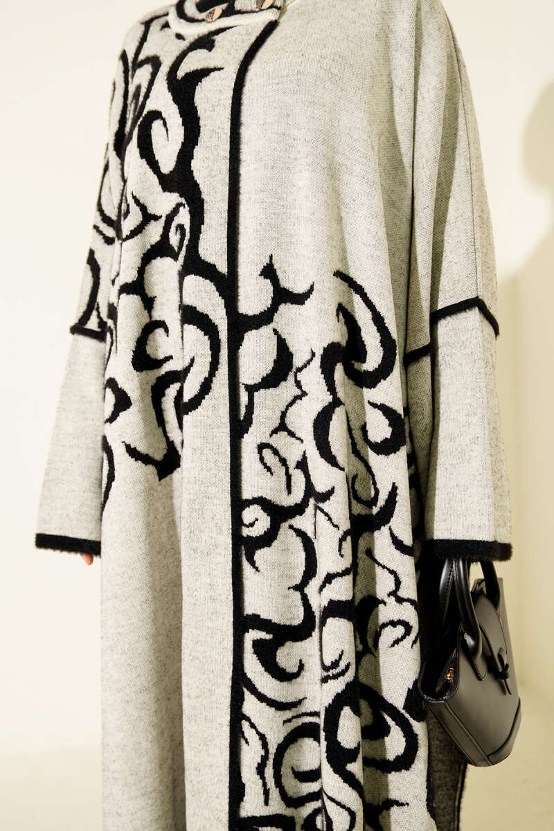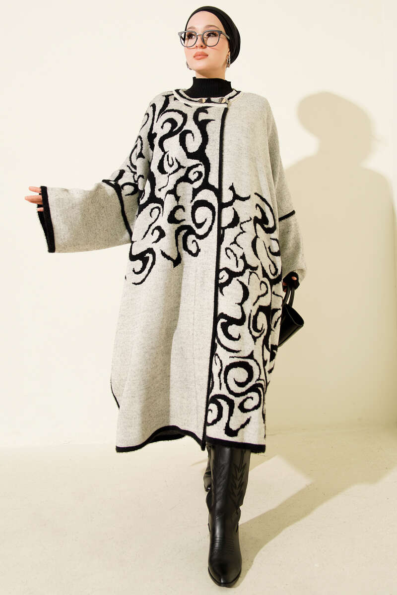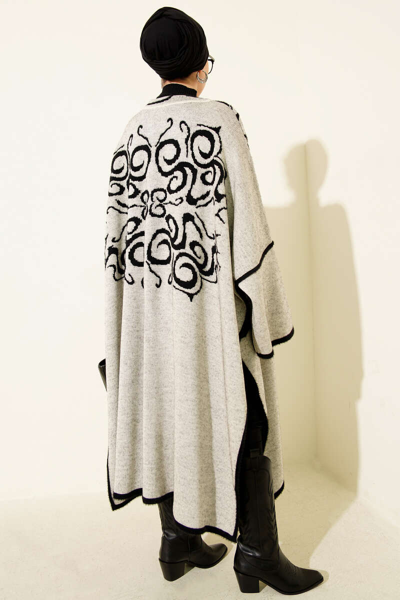 Kilim Desen Kapüşonlu Panço Siyah Kahve