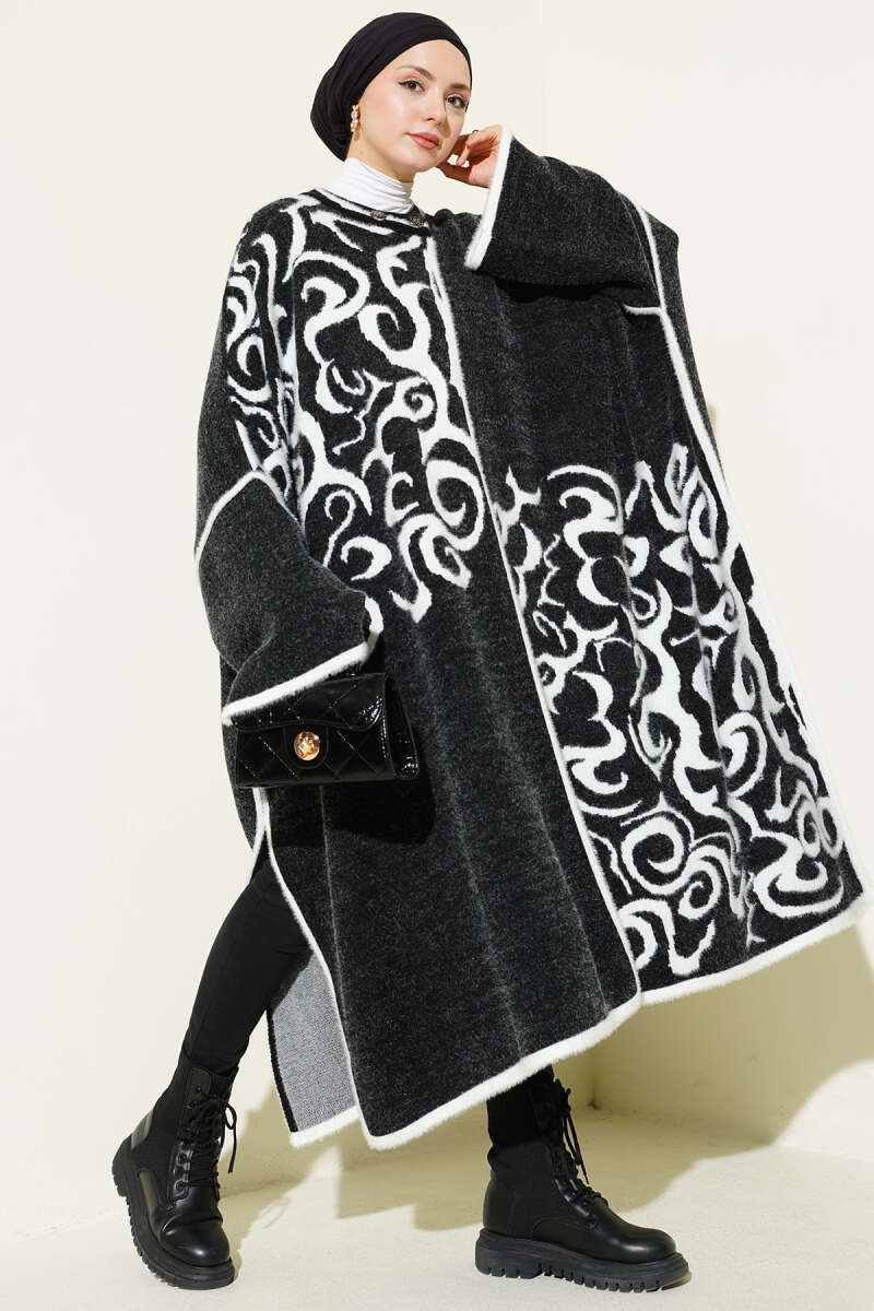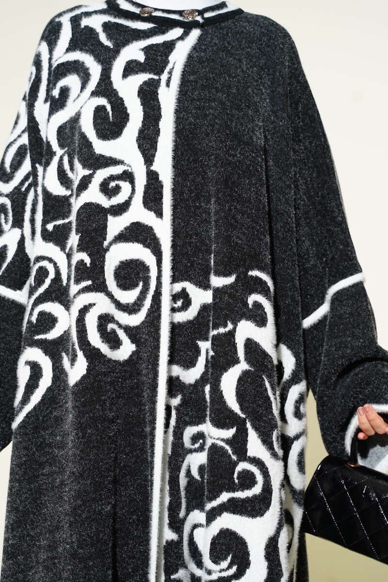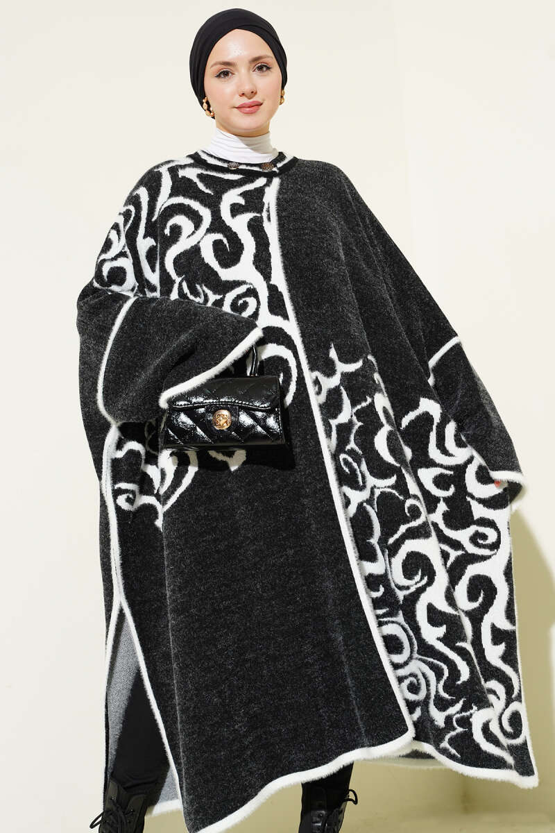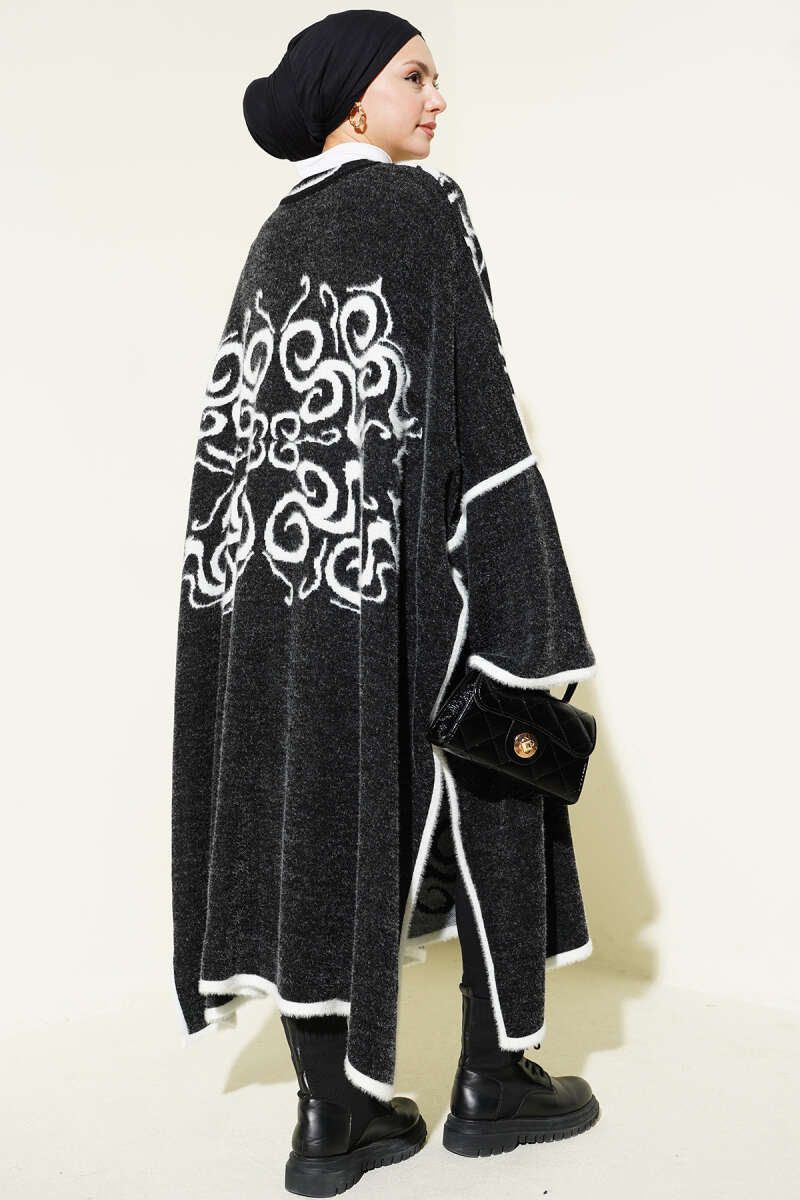Angora Detaylı Yaka Düğmeli Panço Siyah Beyaz