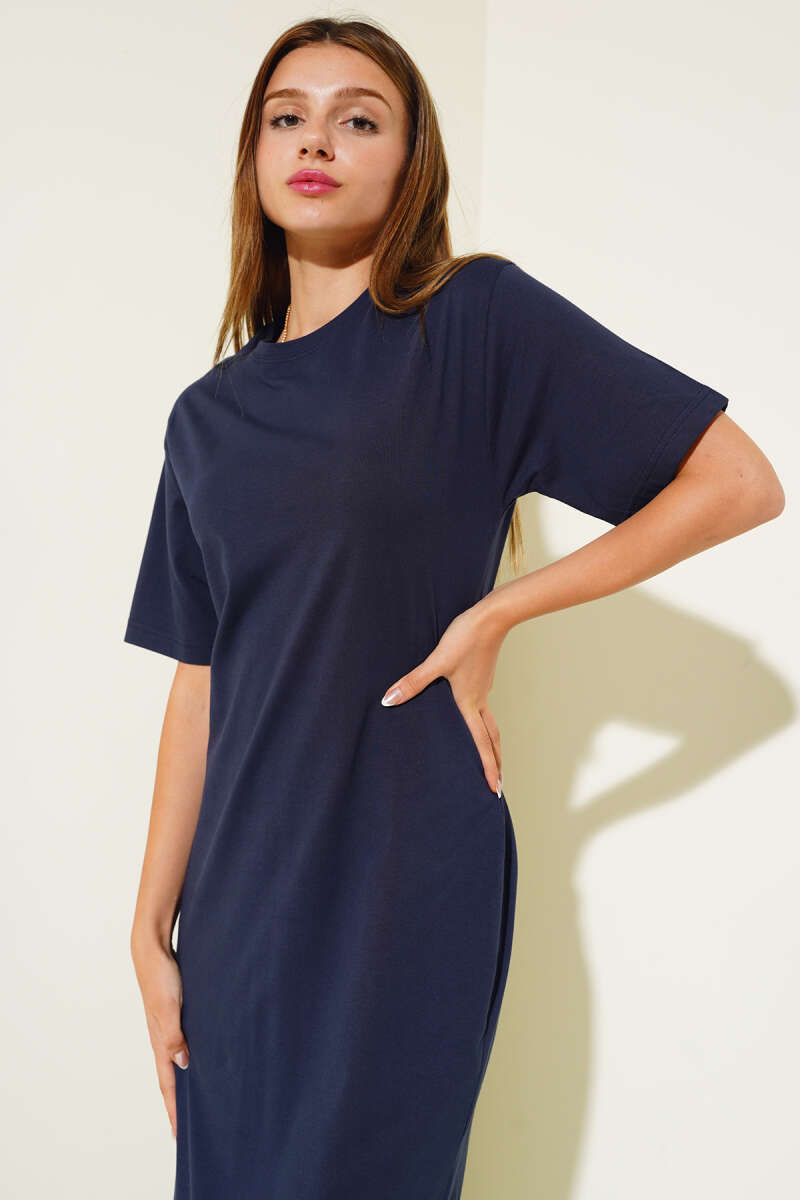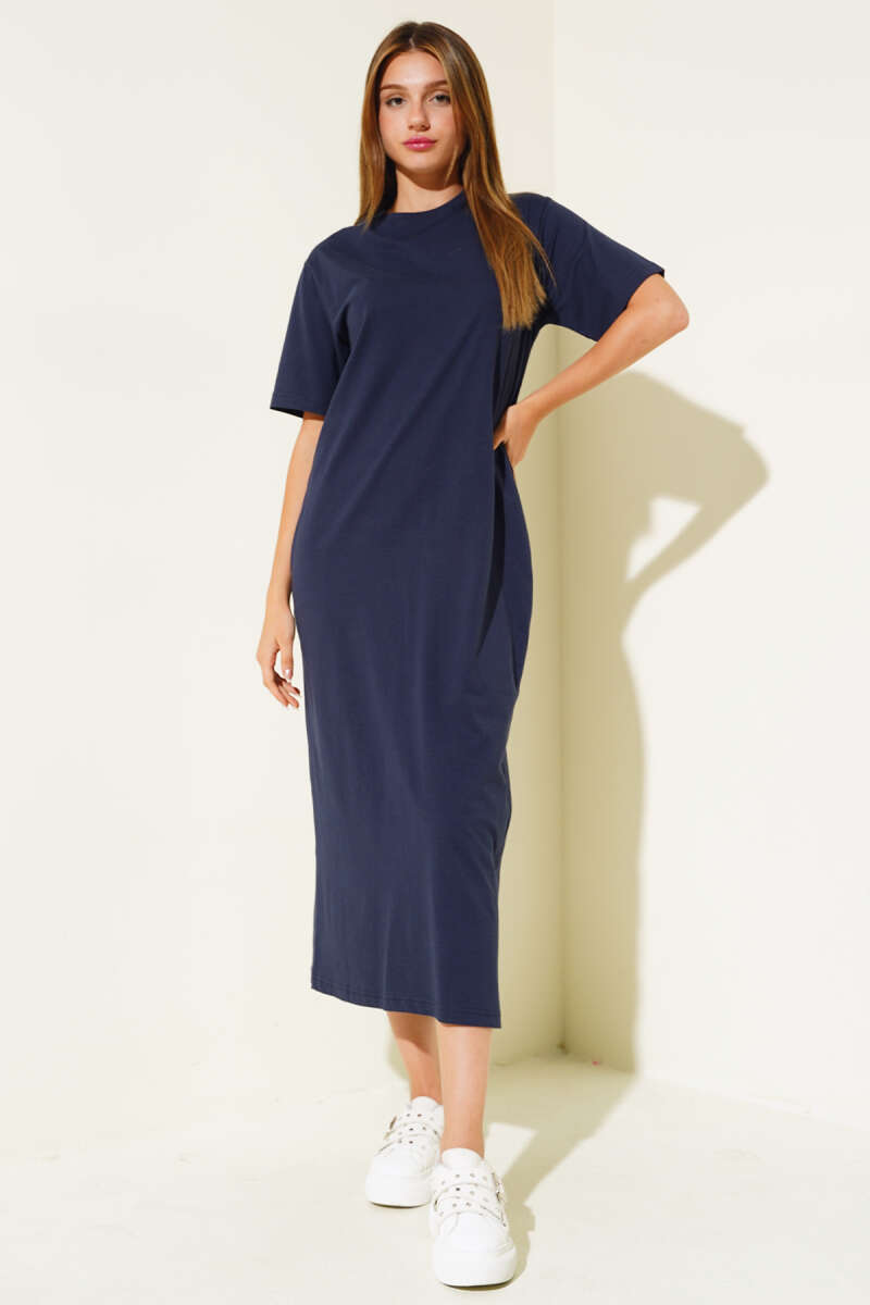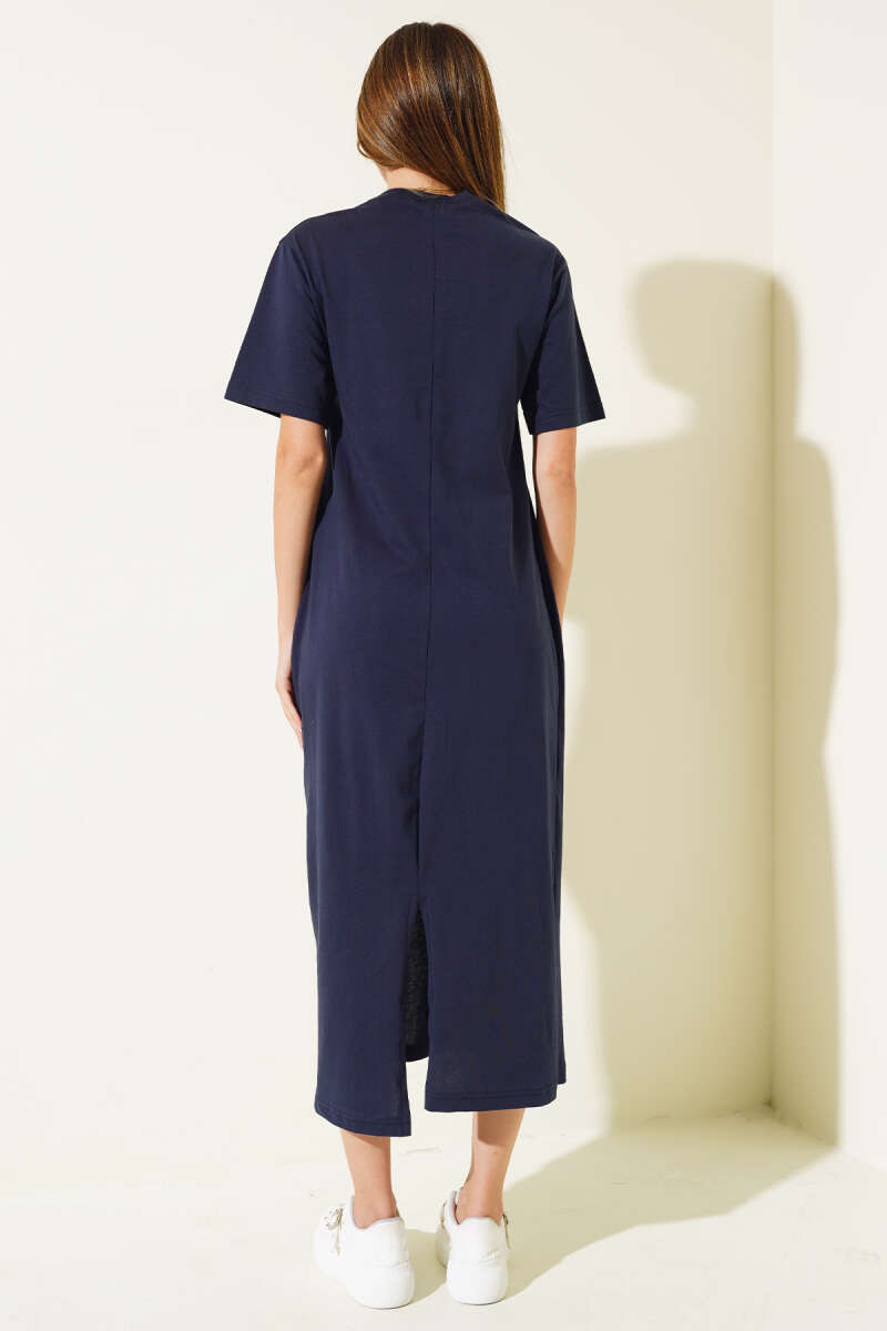 Metal Düğmeli Kolsuz Kot Elbise Koyu Mavi