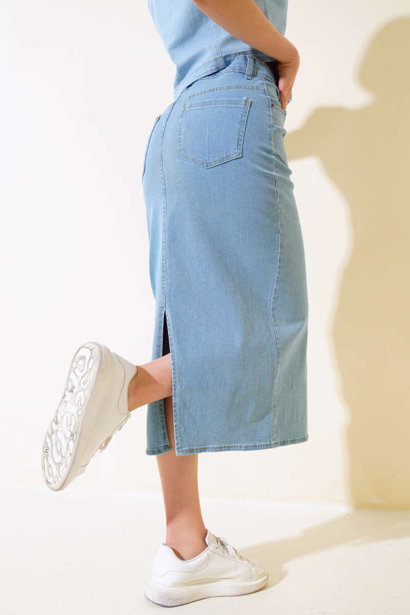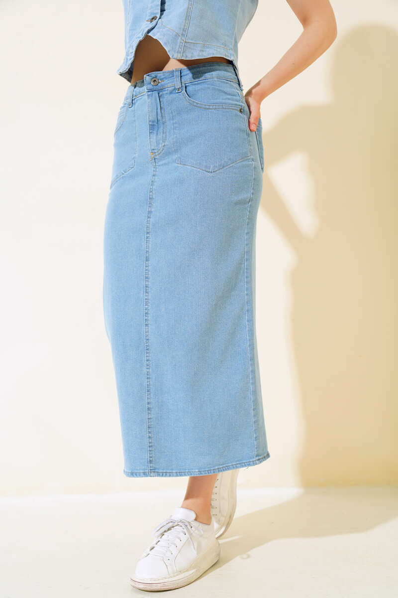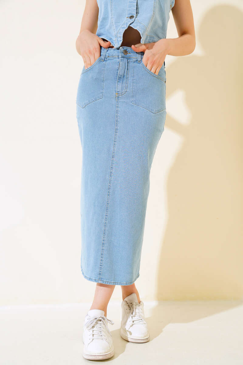 Yeni sezon eteğimiz sizlerle beraber. Eteğimizin beli düğmeli ve fermuarlıdır. İki önünde iki arkasında cebi vardır. Eteğimizin arkası yırtmaçlıdır. Belinde beş adet kemer köprüsü vardır.