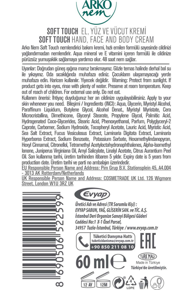 Arko Nem Soft Touch Hızlı Emilen Bakım Kremi 60 ml