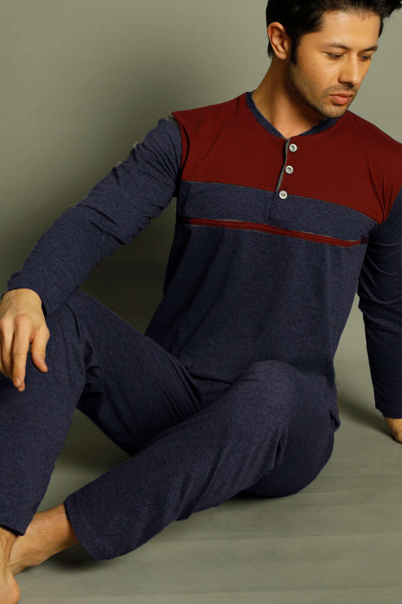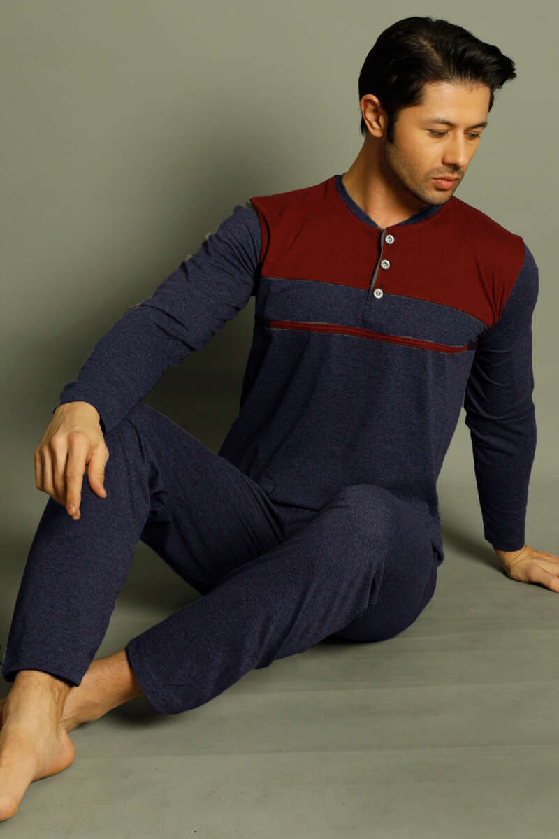 Arma Detaylı Düğme Uzun Kol Erkek Pijama Takımı Lacivert Bordo