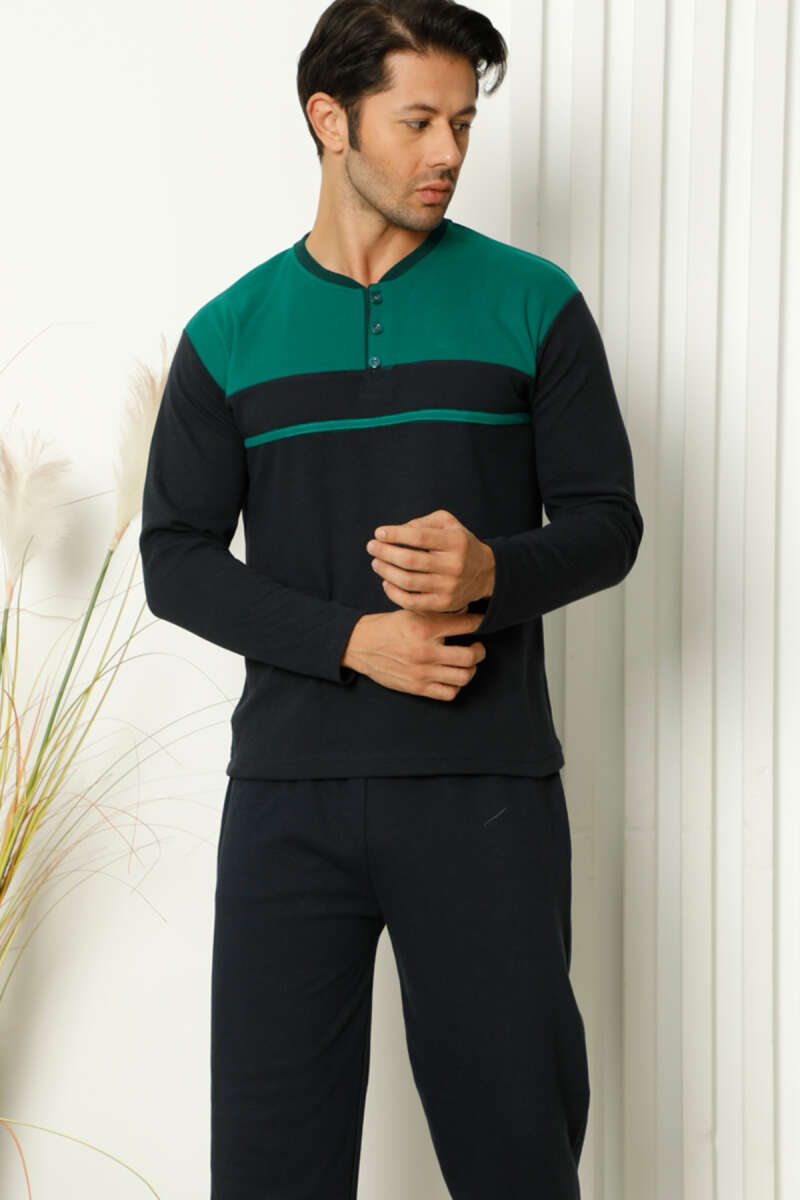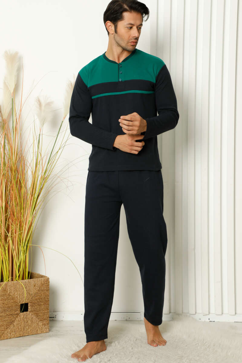 Arma Detaylı Düğme Uzun Kol Erkek Pijama Takımı Lacivert Yeşil