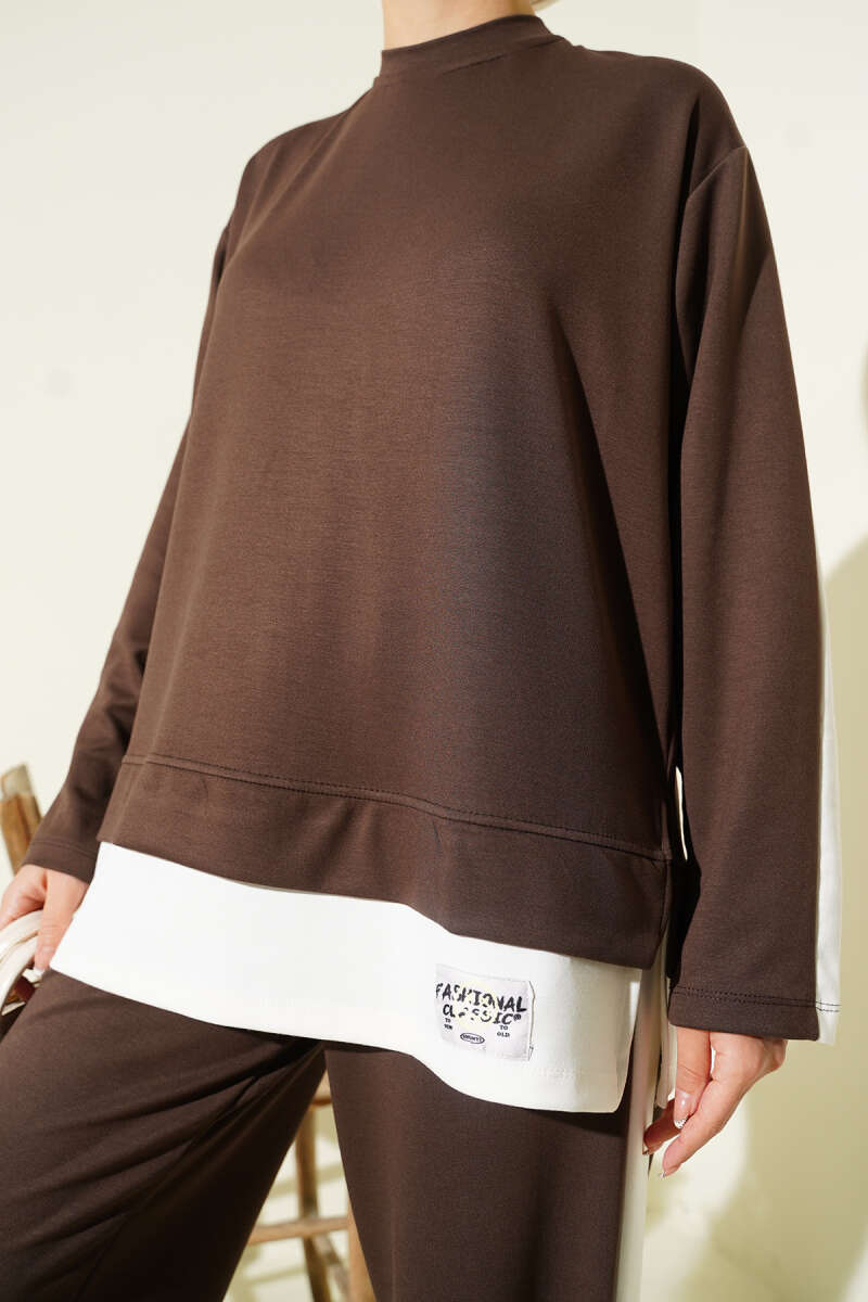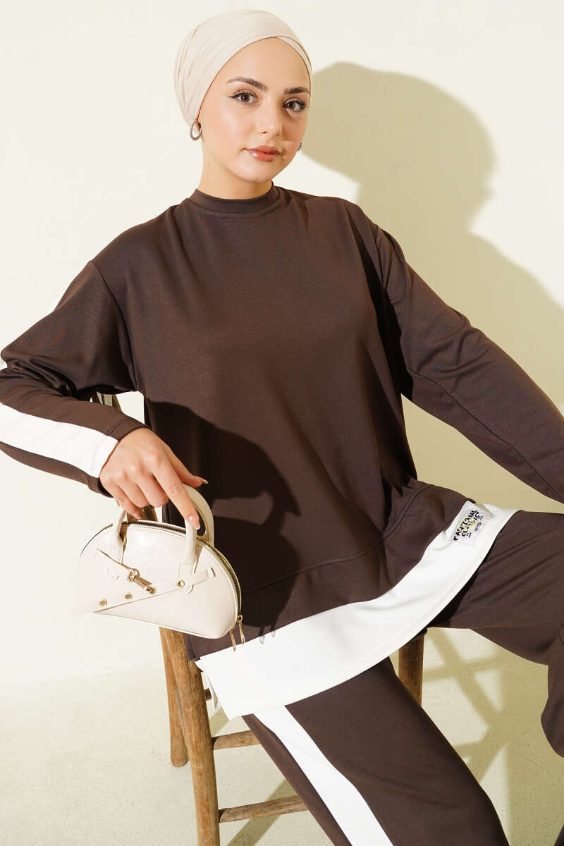 Yatay Çizgili Düşük Omuz Triko Tunik Kahve