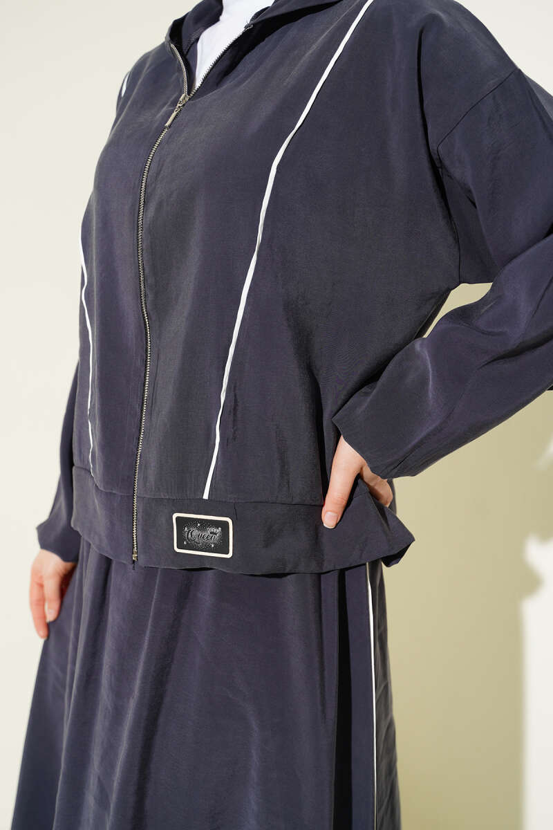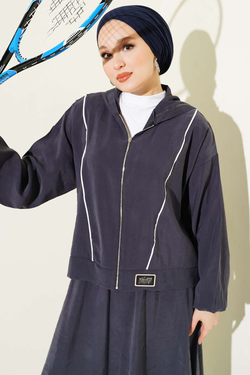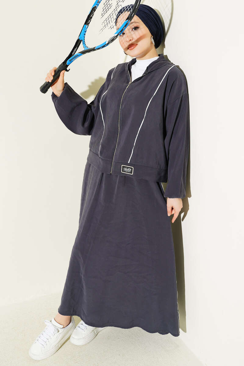 Sportif şıklığı konforla buluşturan bu modal etekli takım, dinamik şerit detayları ve fermuarlı üst tasarımıyla günlük stilinize modern bir dokunuş katıyor. Yumuşak dokulu modal kumaşı sayesinde gün boyu rahat bir hareket alanı sunarken, etek ve ceket kombinasyonu çabasız bir zarafet sergiliyor. Üst parçadaki arma detayı ve kapüşon formu tasarıma enerjik bir hava katarken, düz kesim uzun etek silüeti dengeli bir duruş sağlıyor. Hem hafta sonu aktiviteleri hem de rahat günlük kullanımlar için ideal olan bu takım, fonksiyonelliği ve stil sahibi çizgileri bir araya getiriyor.