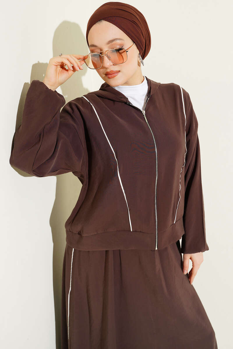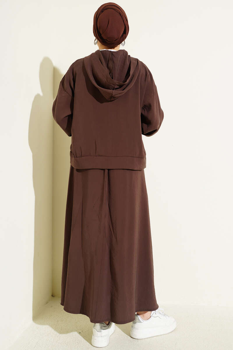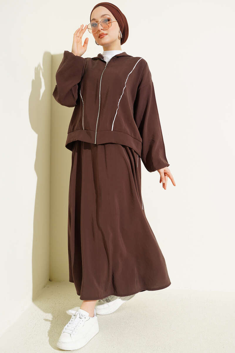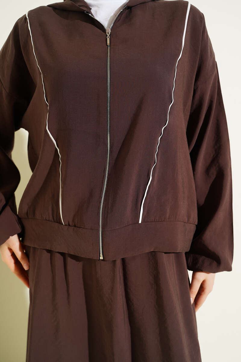 Sportif şıklığı konforla buluşturan bu modal etekli takım, dinamik şerit detayları ve fermuarlı üst tasarımıyla günlük stilinize modern bir dokunuş katıyor. Yumuşak dokulu modal kumaşı sayesinde gün boyu rahat bir hareket alanı sunarken, etek ve ceket kombinasyonu çabasız bir zarafet sergiliyor. Üst parçadaki arma detayı ve kapüşon formu tasarıma enerjik bir hava katarken, düz kesim uzun etek silüeti dengeli bir duruş sağlıyor. Hem hafta sonu aktiviteleri hem de rahat günlük kullanımlar için ideal olan bu takım, fonksiyonelliği ve stil sahibi çizgileri bir araya getiriyor.