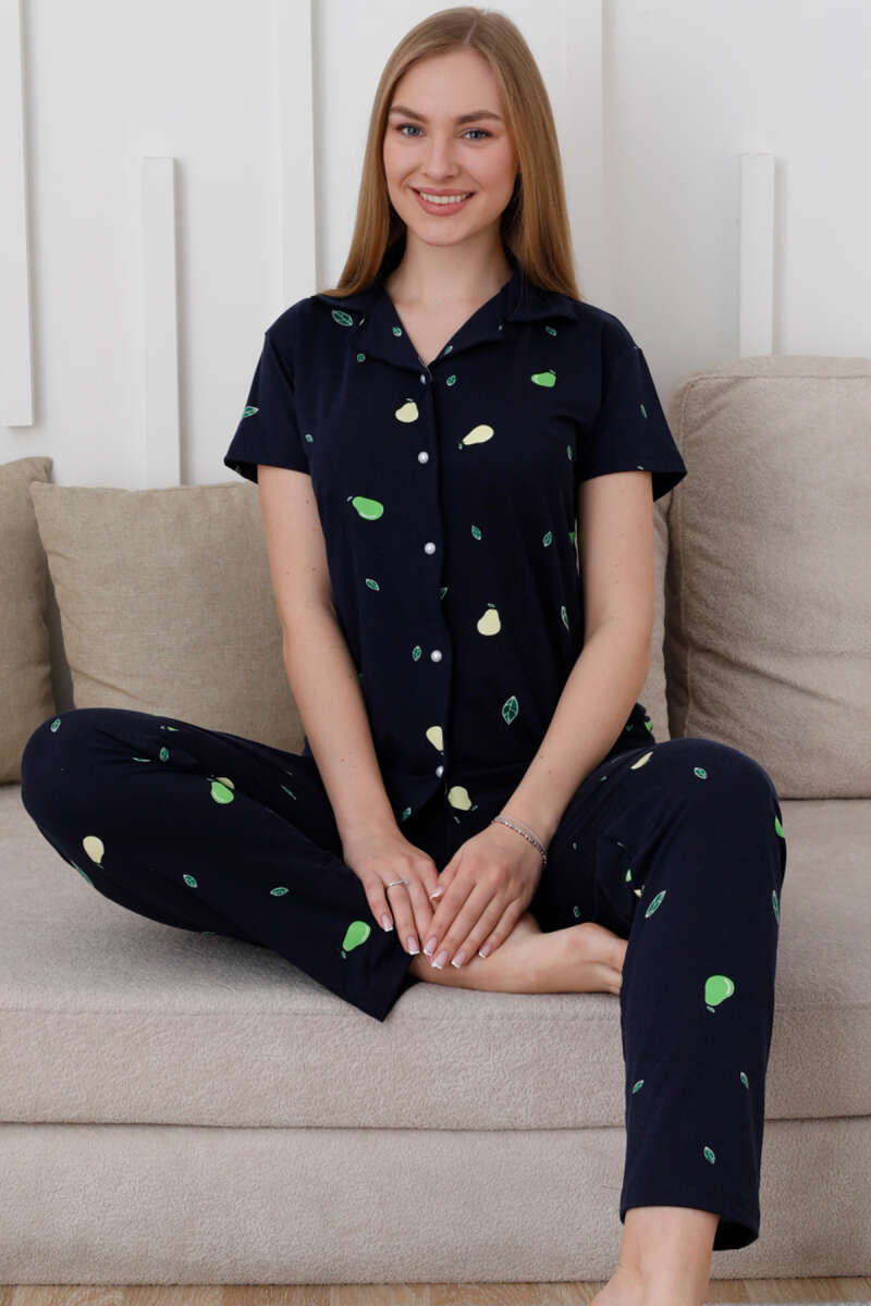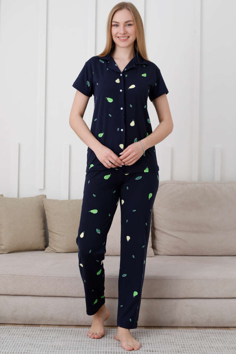 Armut Desen Düğmeli Kısa Kol Pijama Takım Lacivert