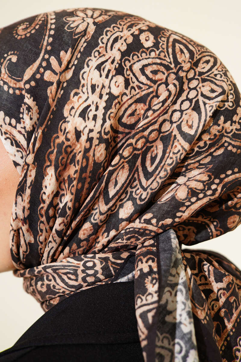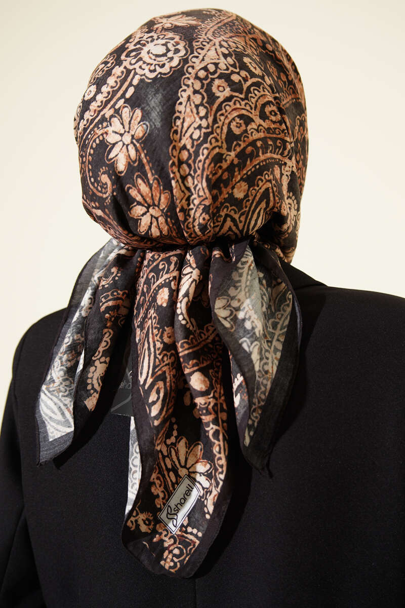Çiçekli Şeritli Bambu Kraş Eşarp Camel