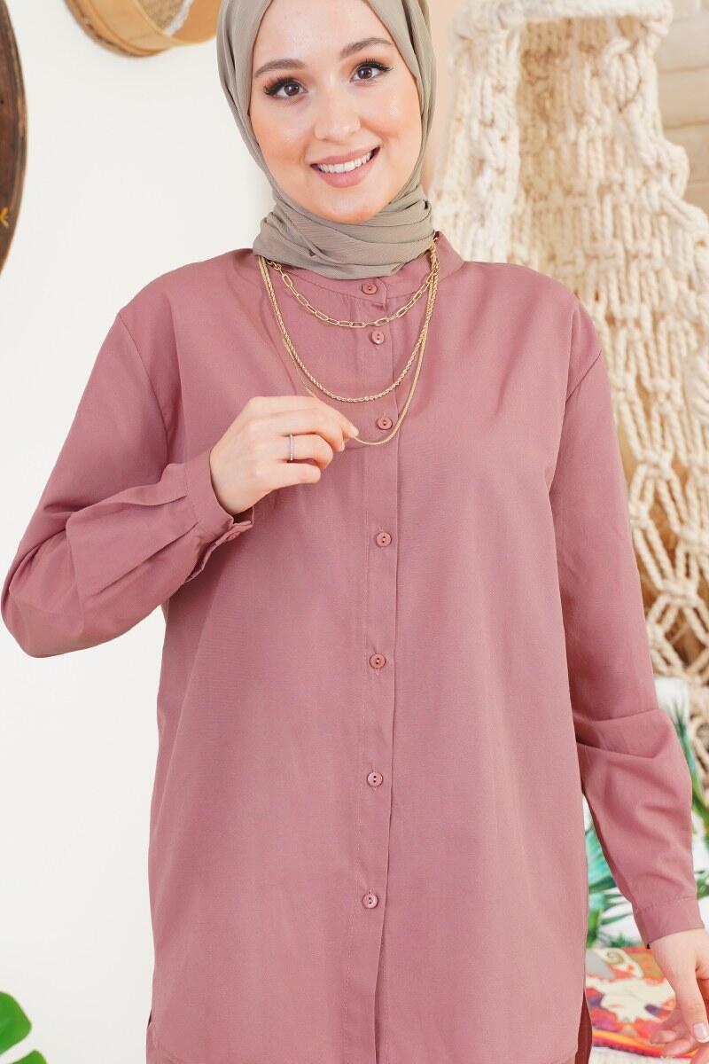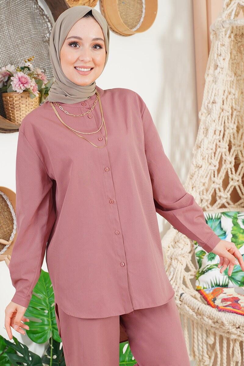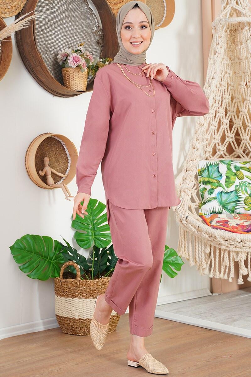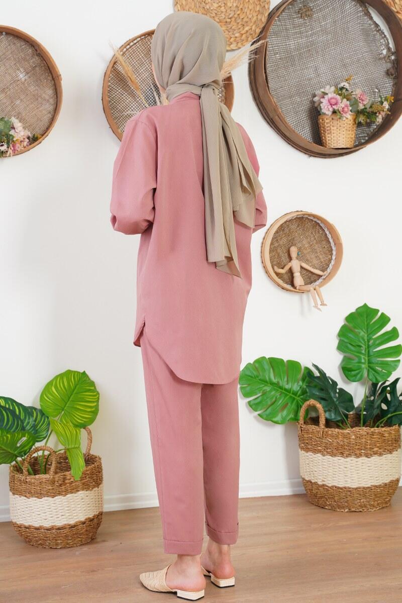 Gül kurusu ikili takım yeni sezon modeldir. Tiril tiril yapıda olan ikili takımın tuniği hakim yakalıdır. Boydan aktif kullanmaya uygun düğmelidir. Manşet kola sahiptir. Arkası önünden 8 cm uzundur. Pantolonun beli lastikli olup iki adet cepleri bulunur. Paçaları katlama detaylıdır. İç göstermeyen kumaşa sahiptir. Renk seçenekleri bulunur.