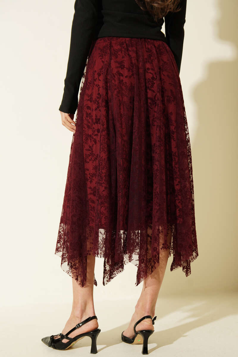 Asimetrik Çiçekli Tül Midi Etek Bordo