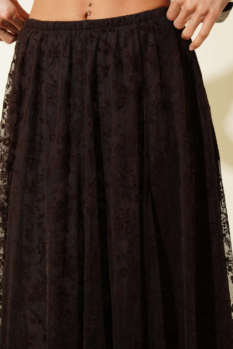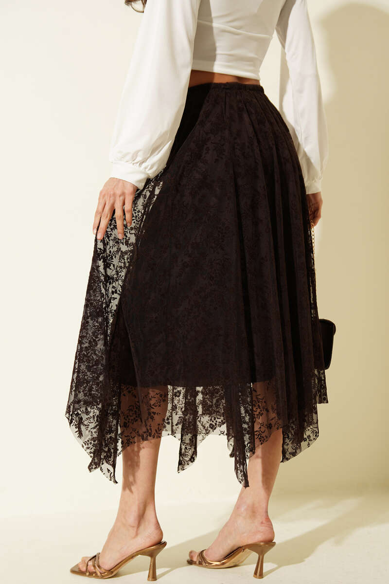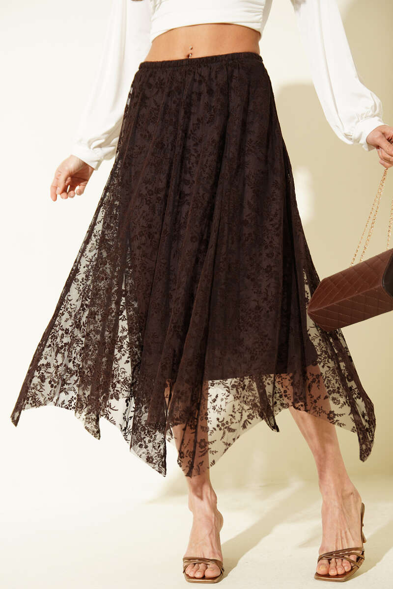 Asimetrik Çiçekli Tül Midi Etek Kahve