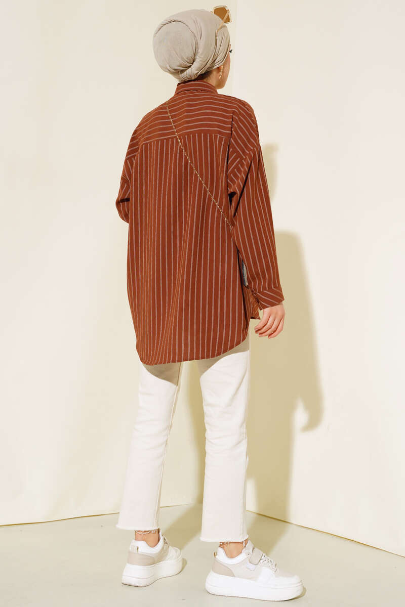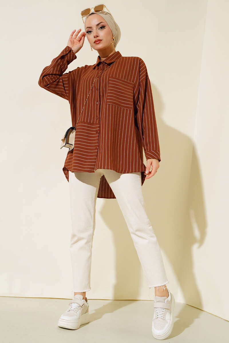 Yeni sezon gömlek modelimiz sizlere beraber. Asimetrik olan gömlek modelimiz şıklık kazanmıştır. Önü kısa arkası uzun modeldir. Çizgili model olan gömleğimiz salaştır. Oversize modeldir. Bir adet göğüs cebi bulunmaktadır. Önü boydan düğmelidir. Gömleğimizin renk seçenekleri mevcuttur.