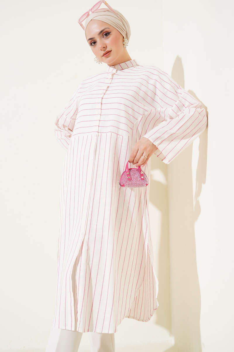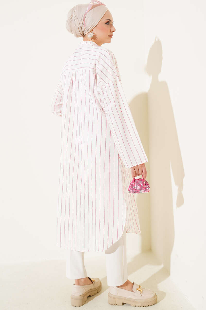 Asimetrik Çizgili Uzun Keten Gömlek Pembe