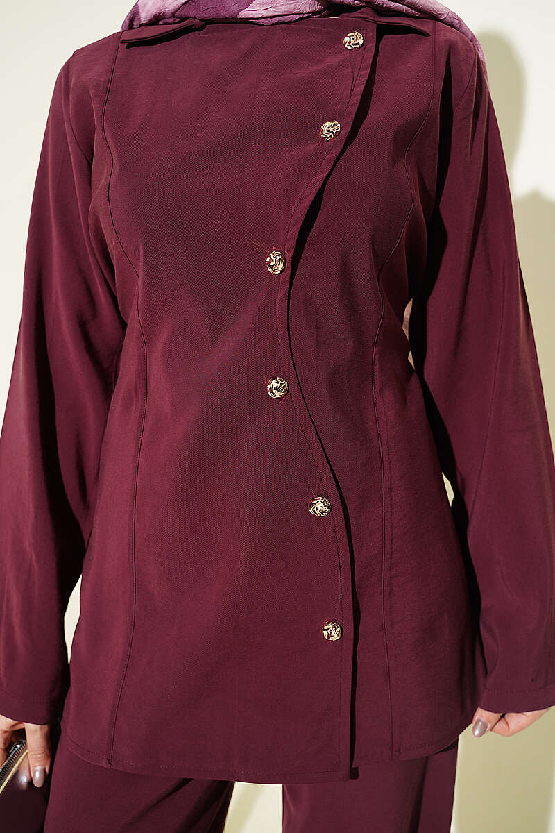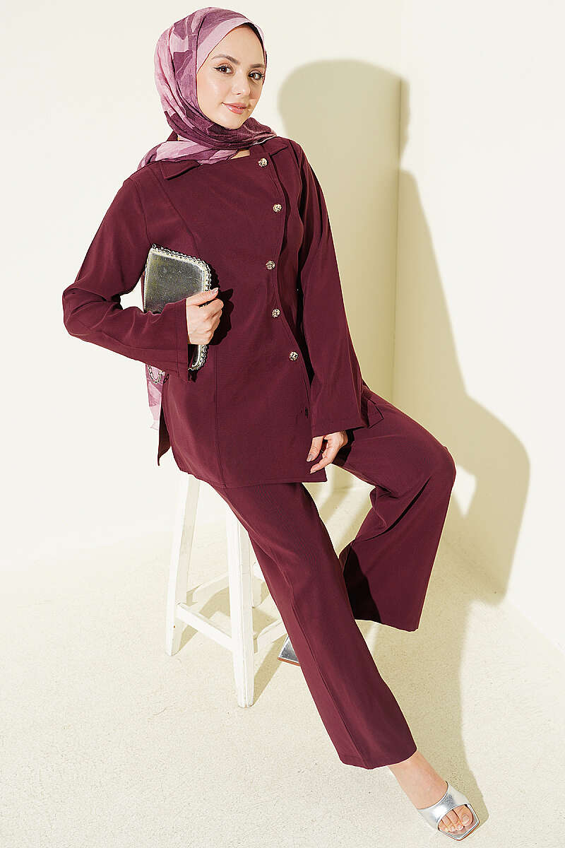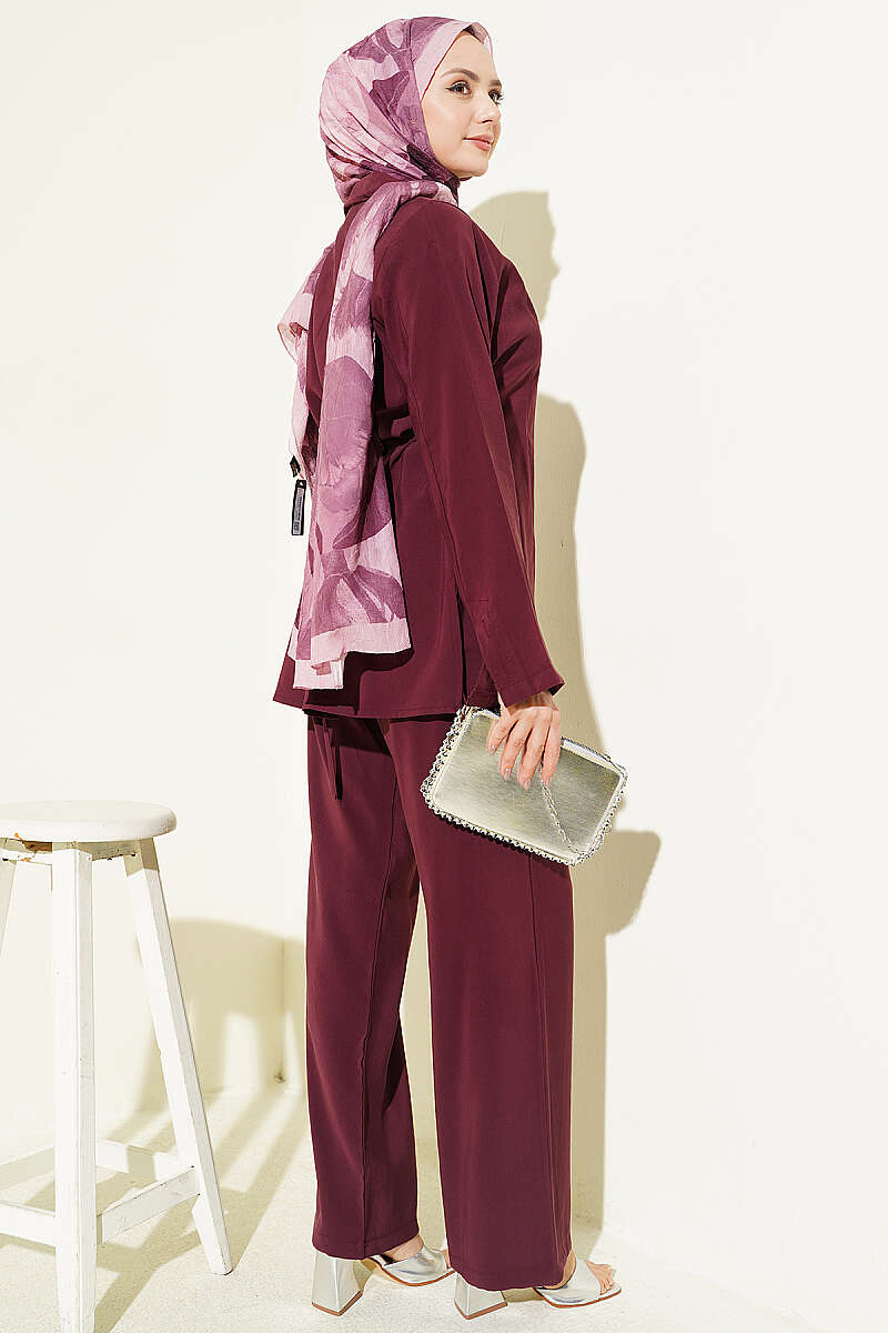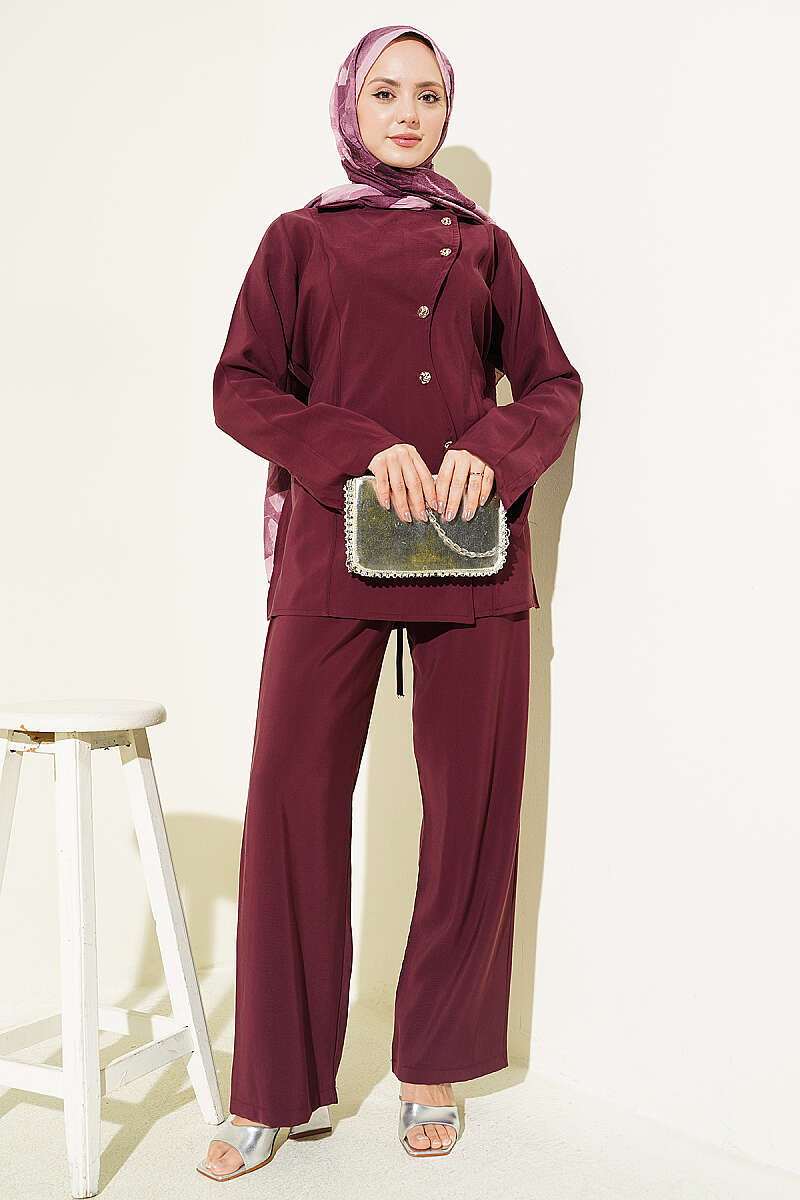 Asimetrik Düğmeli İpli Tensel İkili Takım Bordo